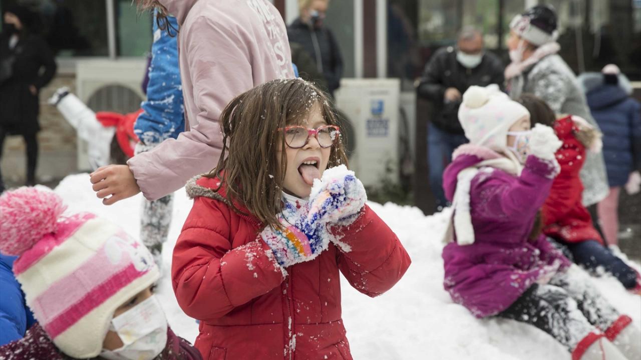 Sahildeki bir kafeteryanın önüne dökülen karı gören çocuklar sevinç yaşadı.