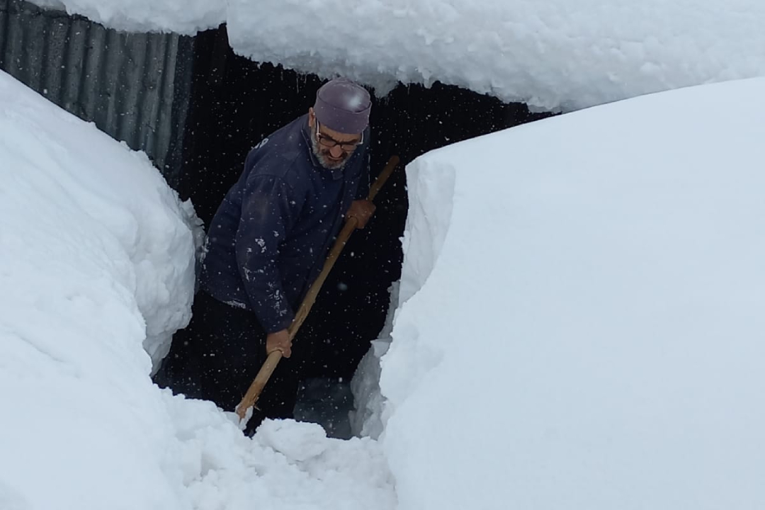 Kar yağışının durmasının ardından köy sakinleri evlerinin çatısını ve çevresini kardan temizlemek için büyük çaba sarf etti.