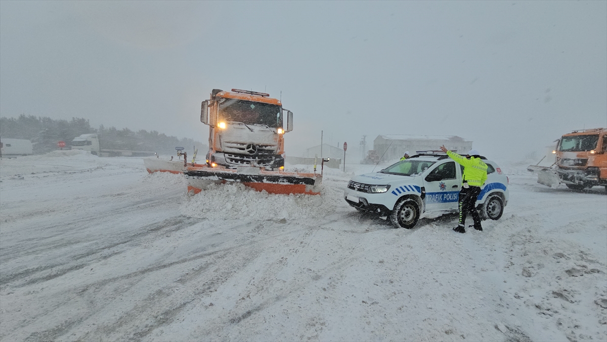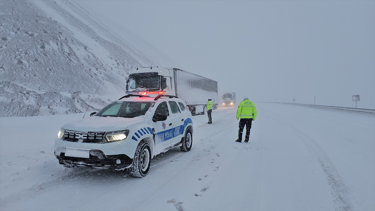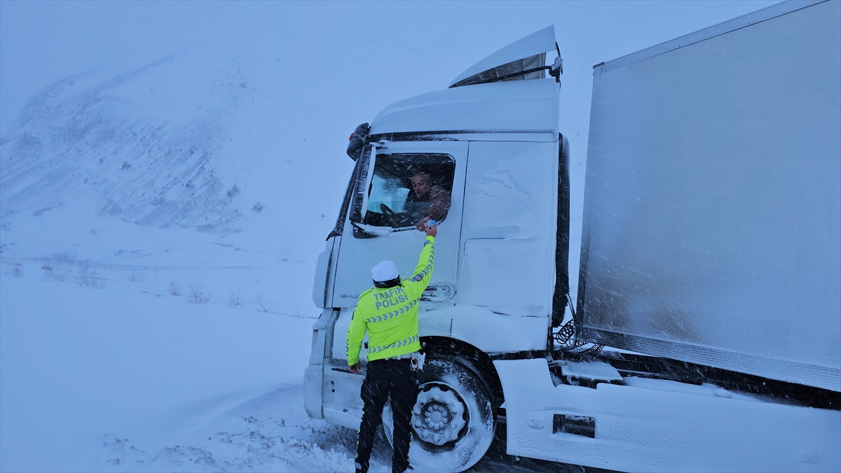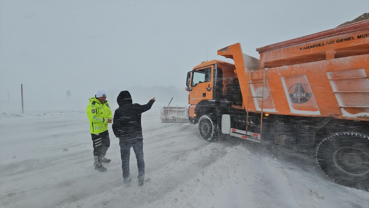Yoğun kar ve tipi nedeniyle ulaşımın aksamaması için güzergah boyunca gece gündüz kar küreme ve tuzlama çalışması yürüten Karayolları ekiplerine trafik polisleri de aldıkları güvenlik önlemleriyle eşlik ediyor.