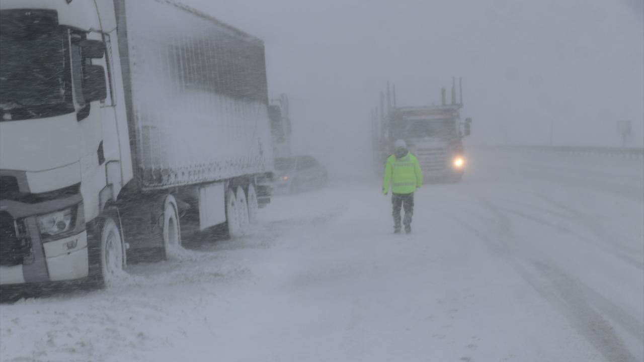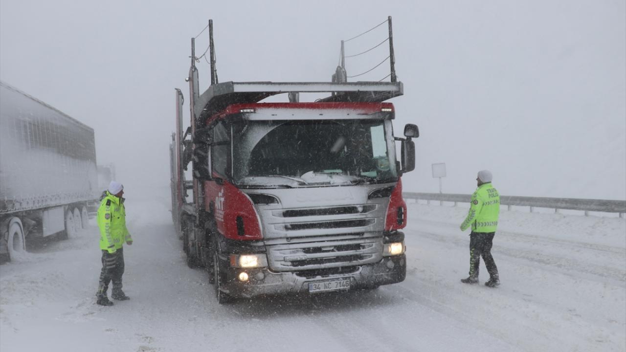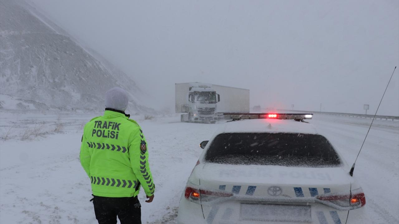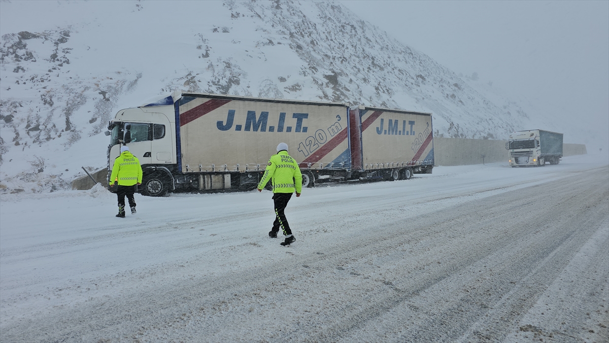 Yoğun kar ve tipi nedeniyle ulaşımın aksamaması için güzergah boyunca gece gündüz kar küreme ve tuzlama çalışması yürüten Karayolları ekiplerine trafik polisleri de aldıkları güvenlik önlemleriyle eşlik ediyor.
