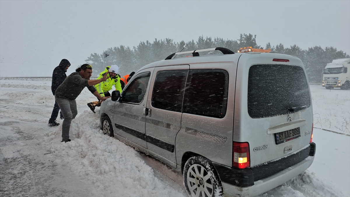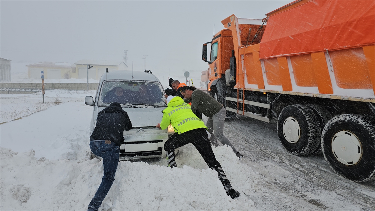 Yüksek rakımlı geçitlerin bulunduğu Erzincan-Sivas güzergahında çalışma yapan Karayolları ekipleri ile trafik polisleri, yoğun kar ve tipide yolda kalanların imdadına yetişiyor.