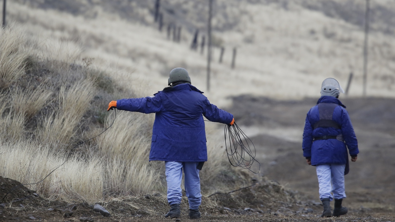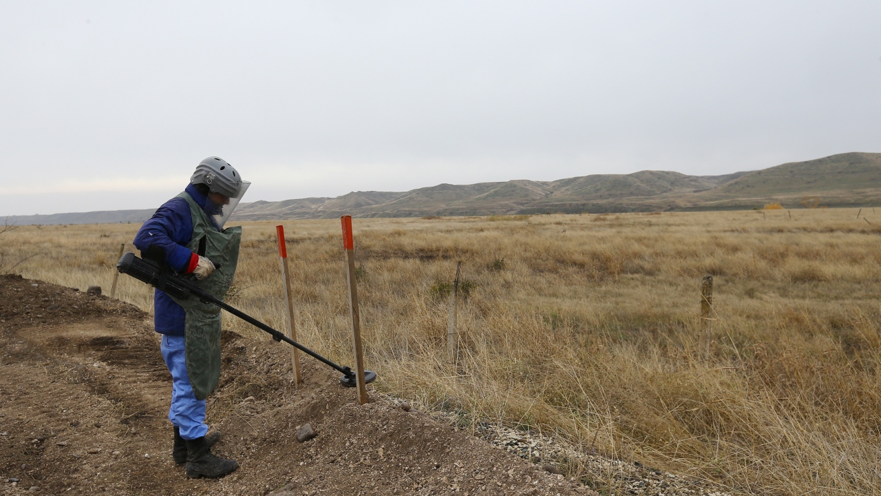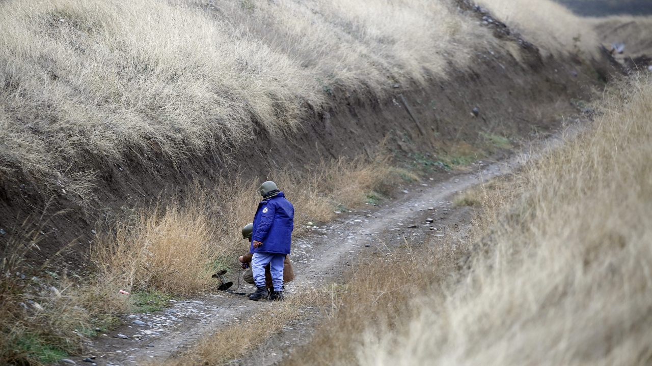 Azerbaycan Ulusal Mayın Temizleme Ajansı (ANAMA) Operasyon Karargahı Müdürü İdris İsmayılov, Terter ile Sukovuşan kentleri arasındaki yolda, mayın temizleme ve imha işlemlerine ilişkin bilgileri basınla paylaştı.