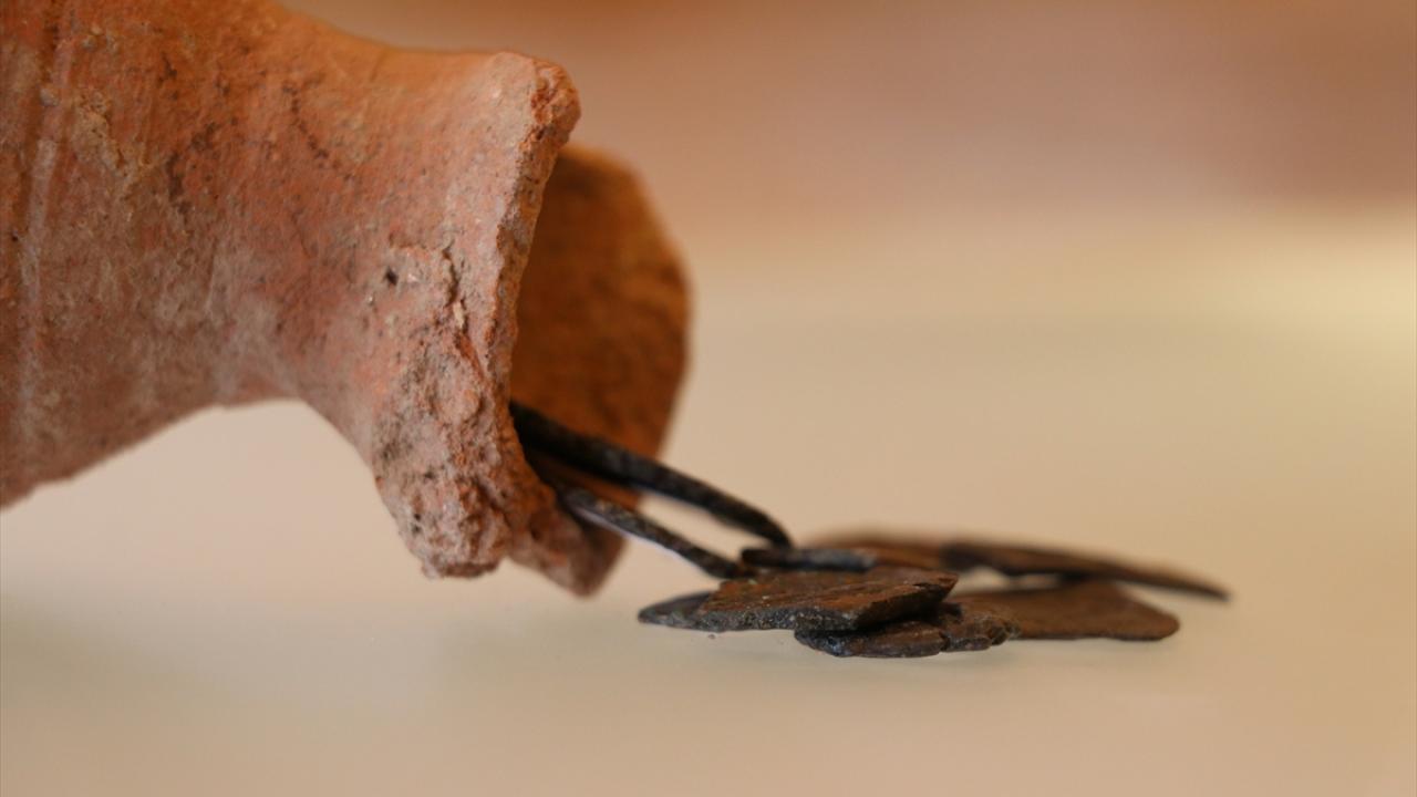 "Terminolojik olarak, yani arkeoloji literatüründe sikkeleri define olarak tanımlamak lazım. Ancak biz bunu parayı bir yere saklama, gömme amacıyla değil de -günümüzde annelerimizin mutfakta paralarını biriktirdiği küçük kutucuklar olur ya- benzer amaçla değerlendirildiğini düşünüyoruz. Mutfak bölümünün içerisinde 10 sikkenin küçük bir testiciğin içinden çıkmasını, o dönemde ailenin ya da evin hanımefendisi tarafından kumbara gibi kullanıldığını düşünüyoruz."