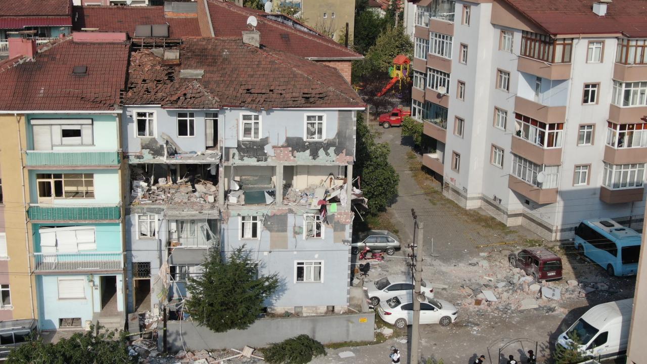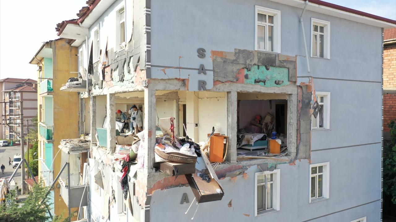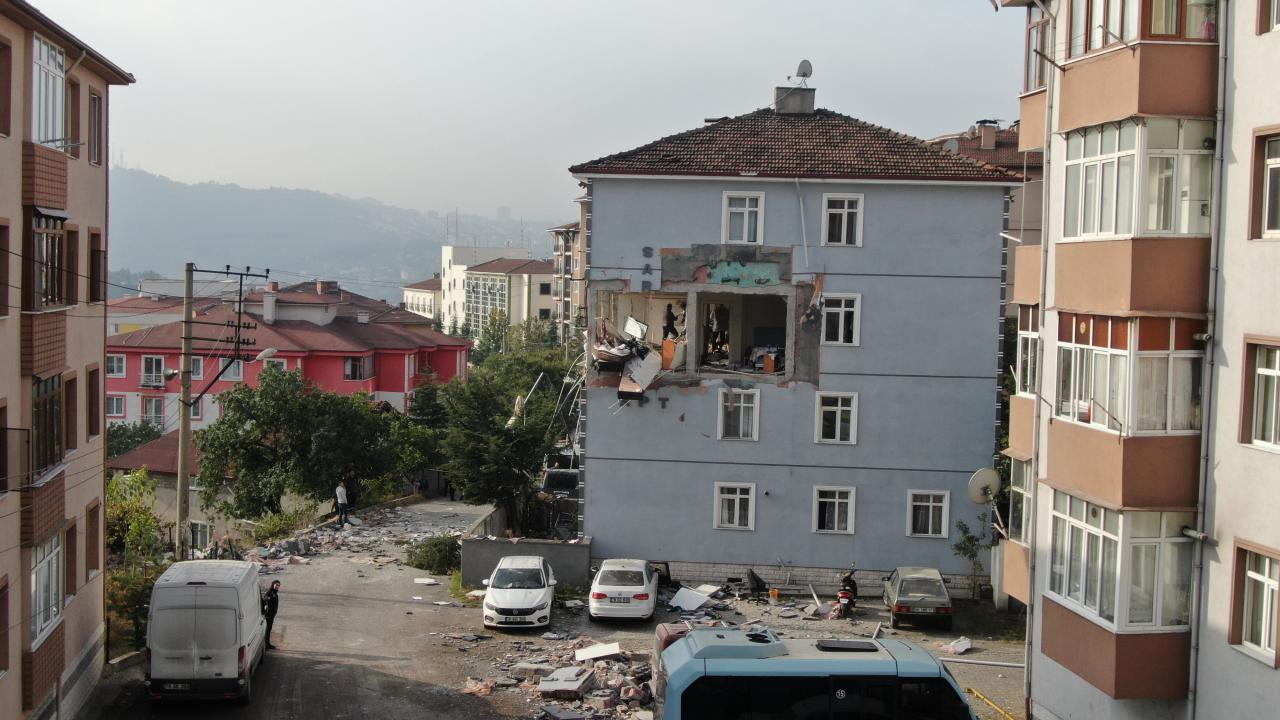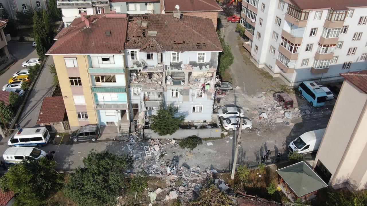 Gece yarısı meydana gelen patlama sonrası can kaybının yaşanmadığı olayından ardından adeta harabeye dönen bir birine bitişik daireler günün ilk ışıkları ile havadan görüntülendi.