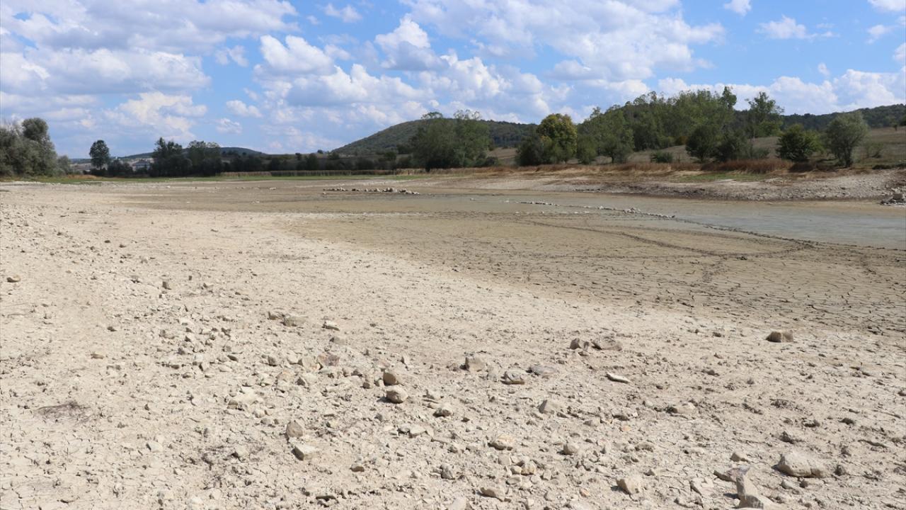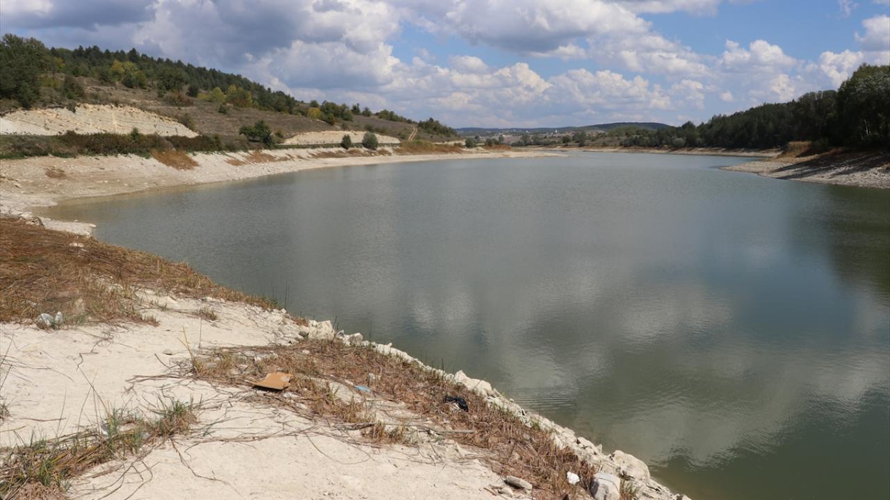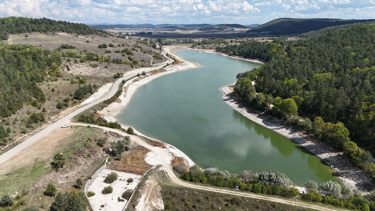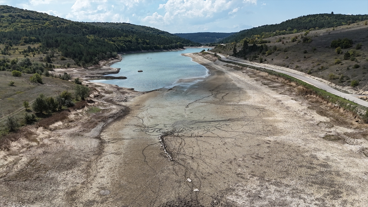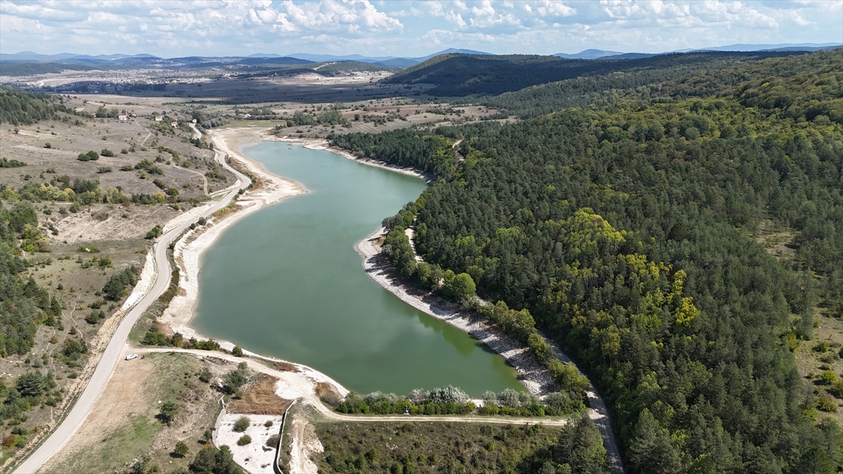 Vana değişimi için su seviyesi azaltılan gölet dronla görüntülendi.