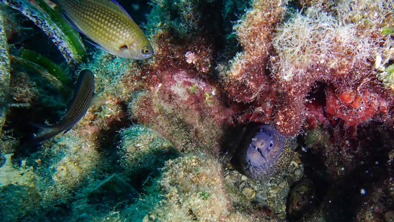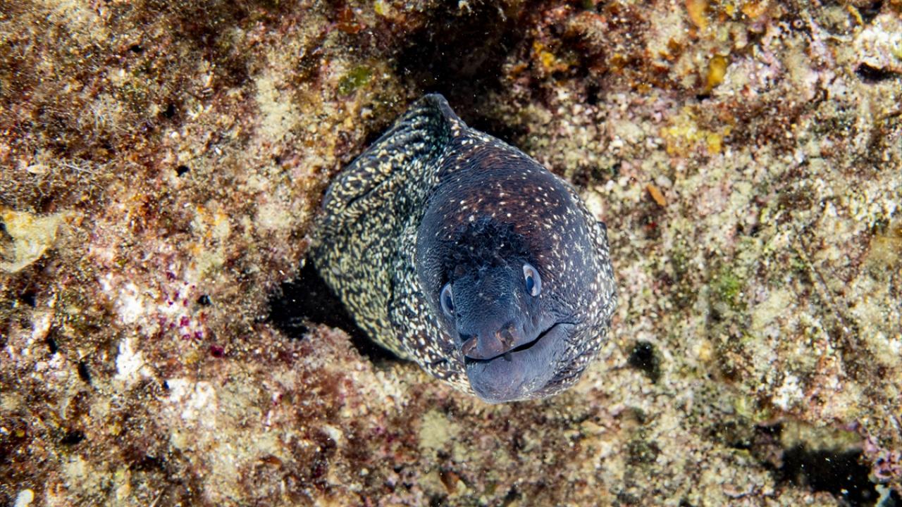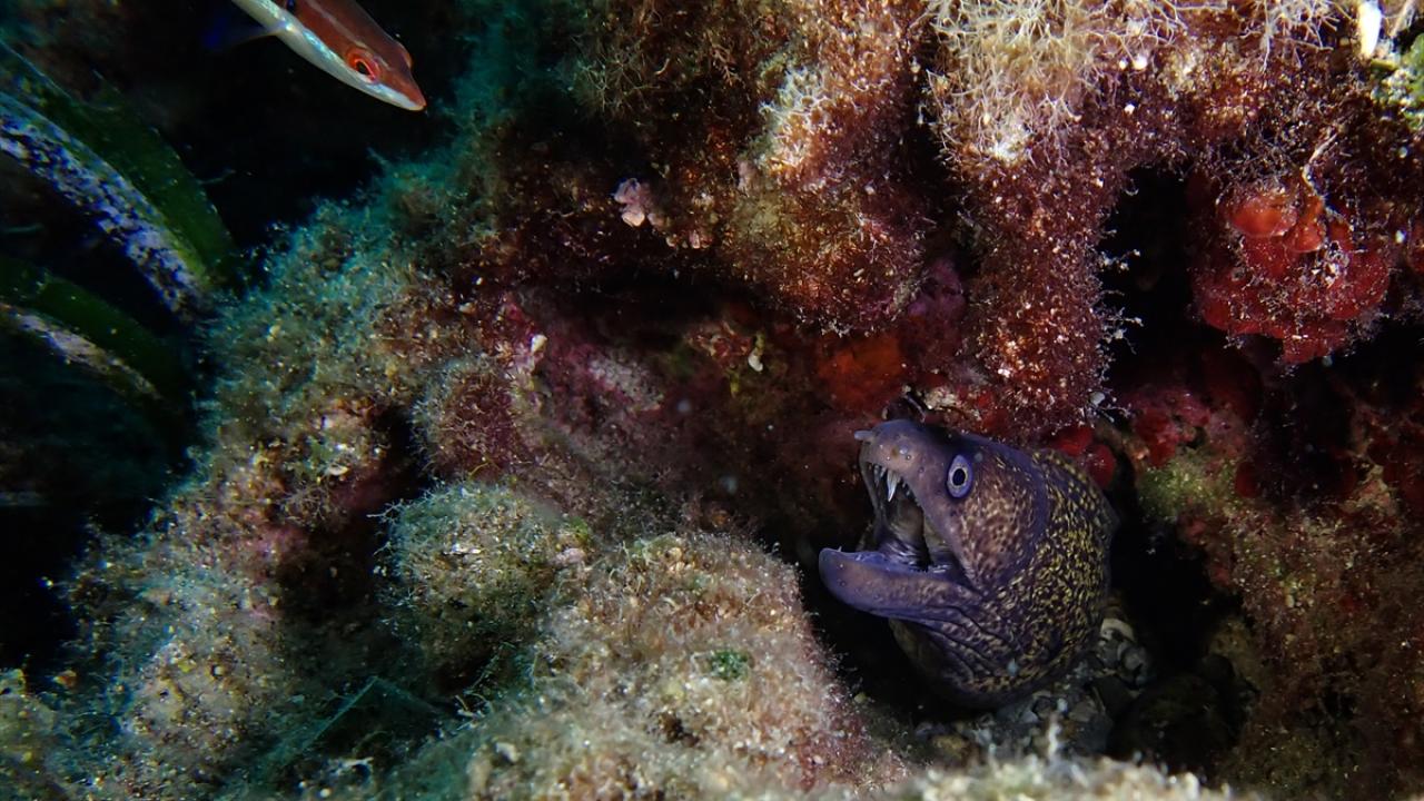 Fotoğrafta Karaburun`da bir kovukta yaşayan müren balığı görülüyor.
