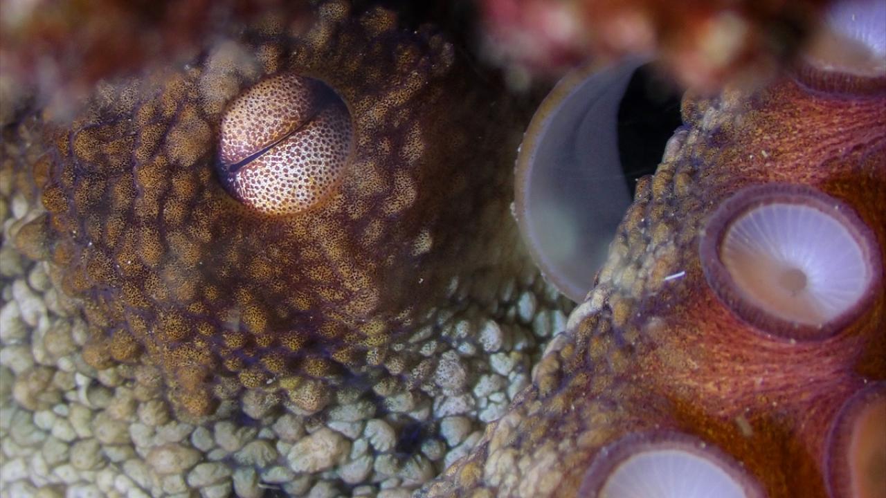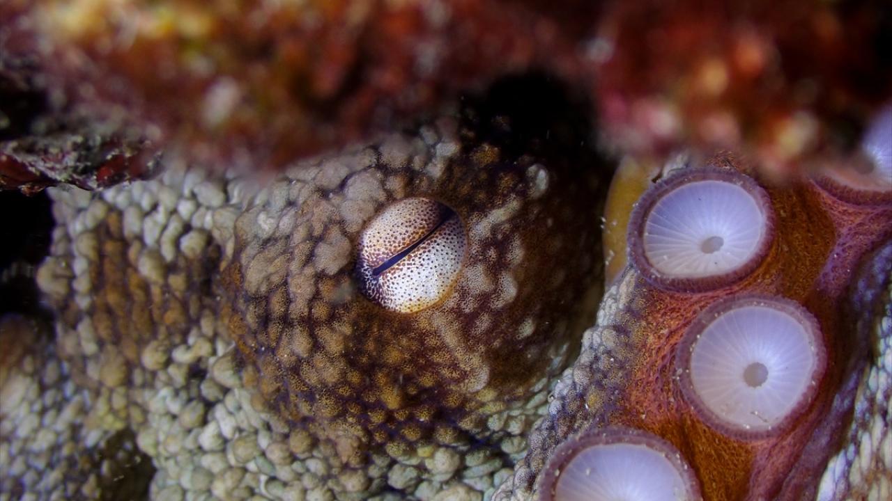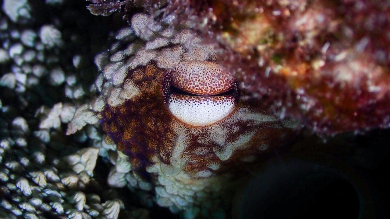 Fotoğrafta Karaburun`da bir kovukta yaşayan ahtapot görülüyor.