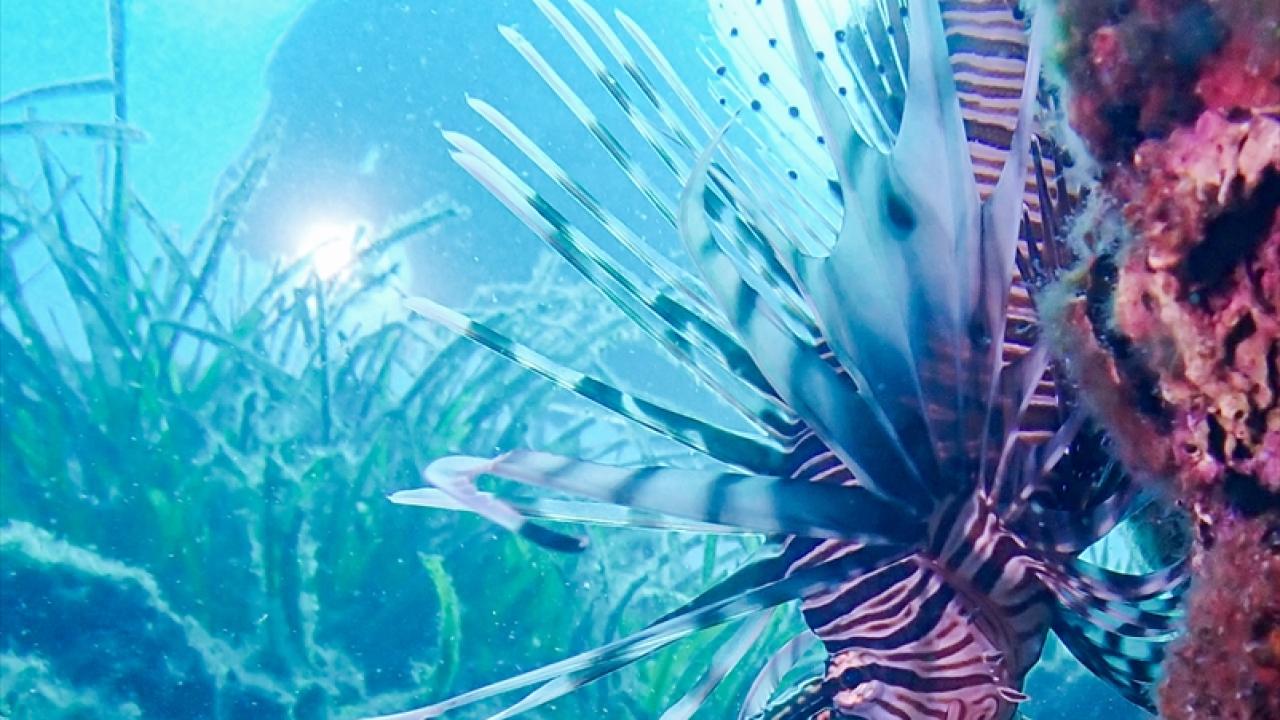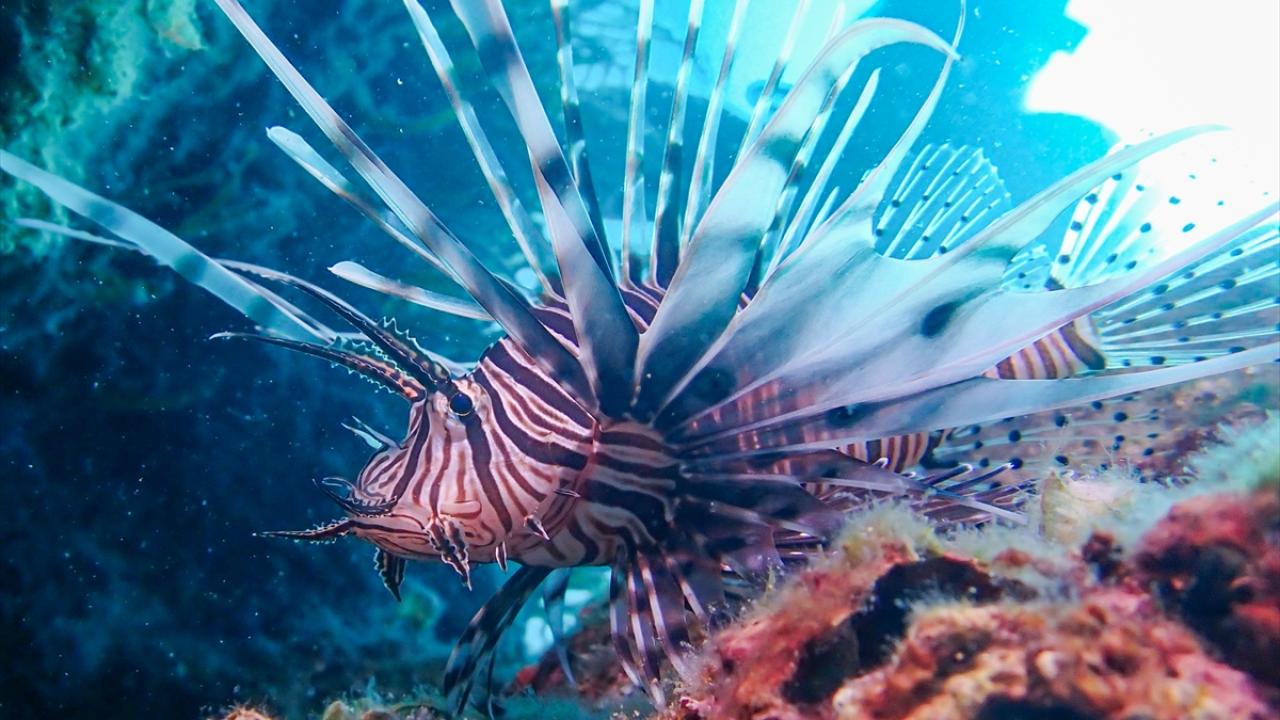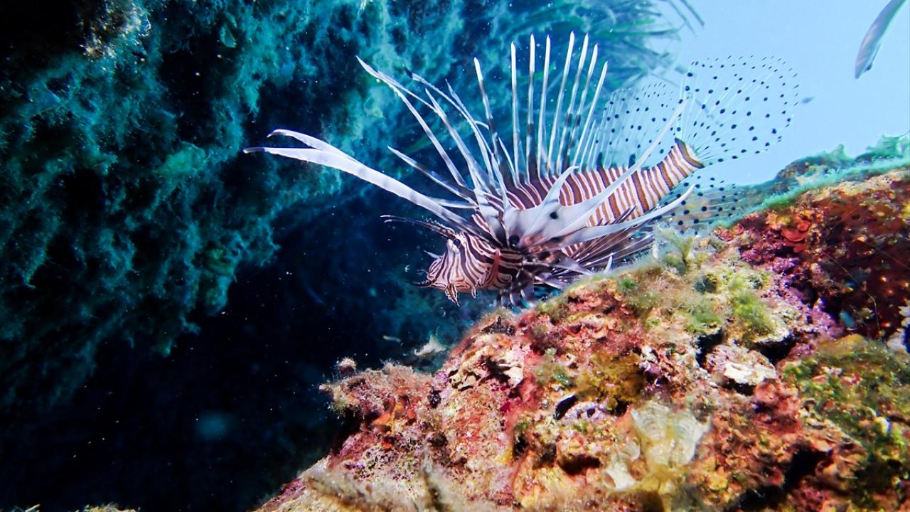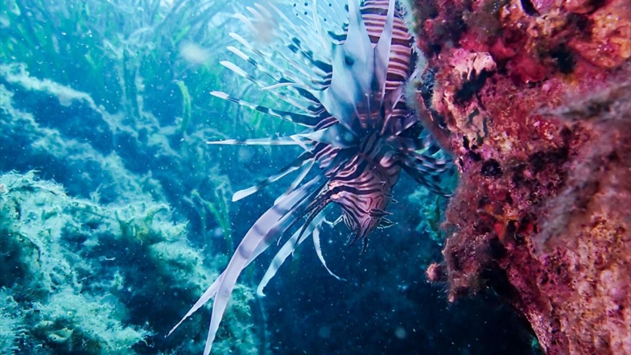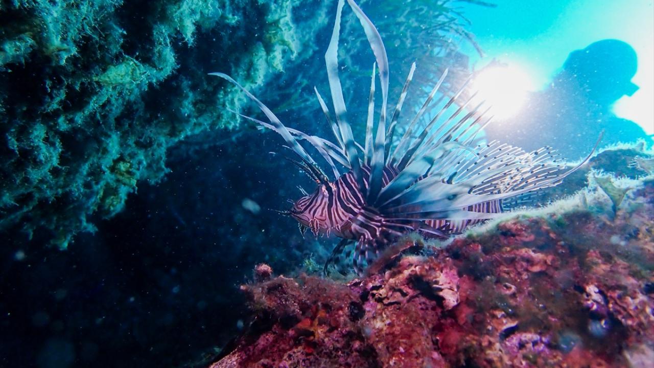 Fotoğrafta Karaburun`da bir kovukta yaşayan aslan balığı görülüyor.