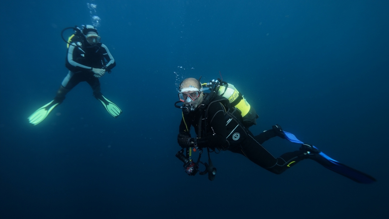 Karaburun`da dalgıçlara bazen yunuslar, bazen akya sürüleri eşlik ediyor.