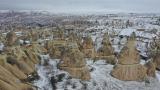 Kapadokya'daki peribacaları kar yağışının ardından beyaz örtüyle kaplandı