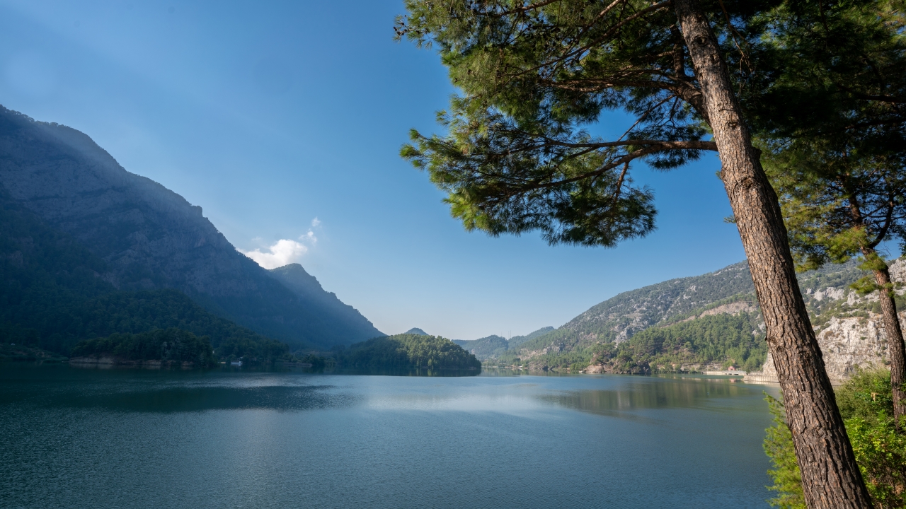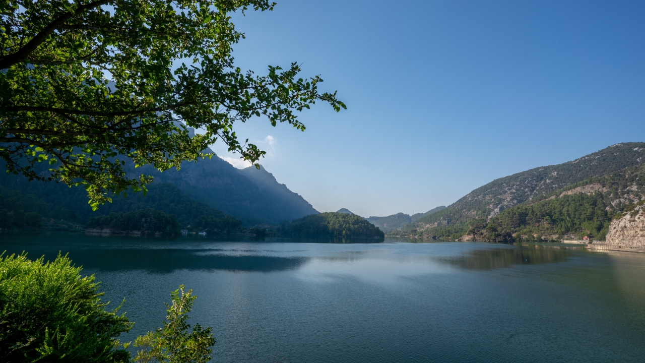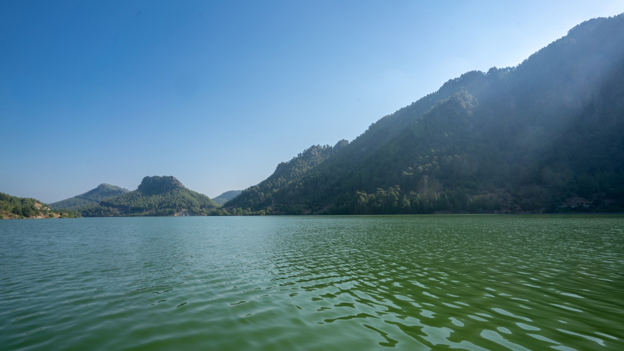 Sulama ve enerji üretimi amacıyla inşa edilen göl yüksek dağlarla çevreli.