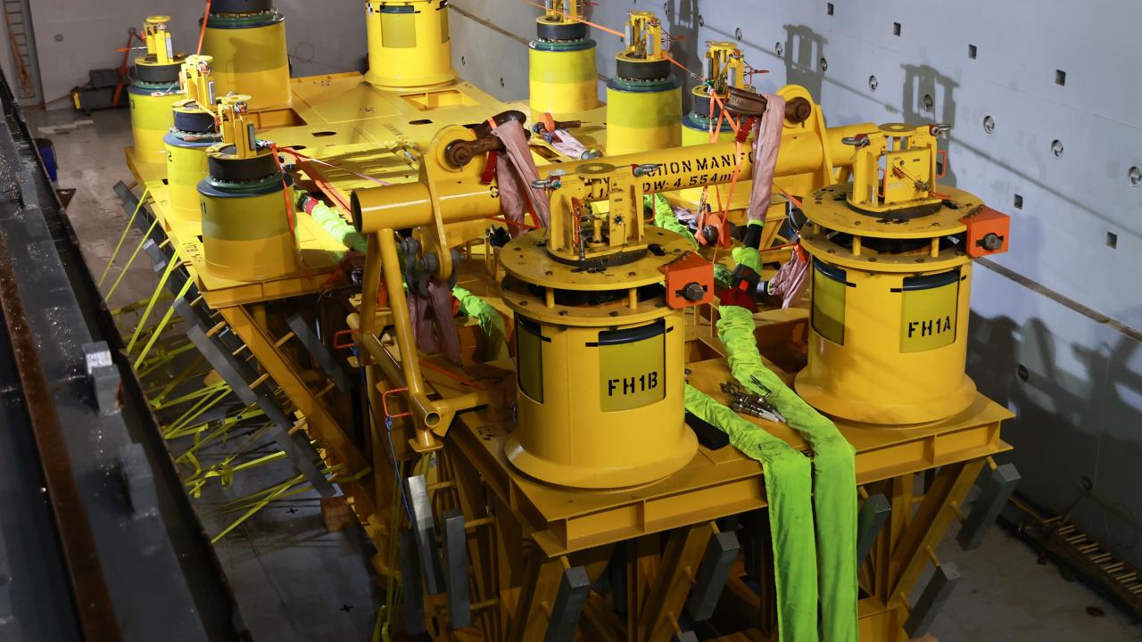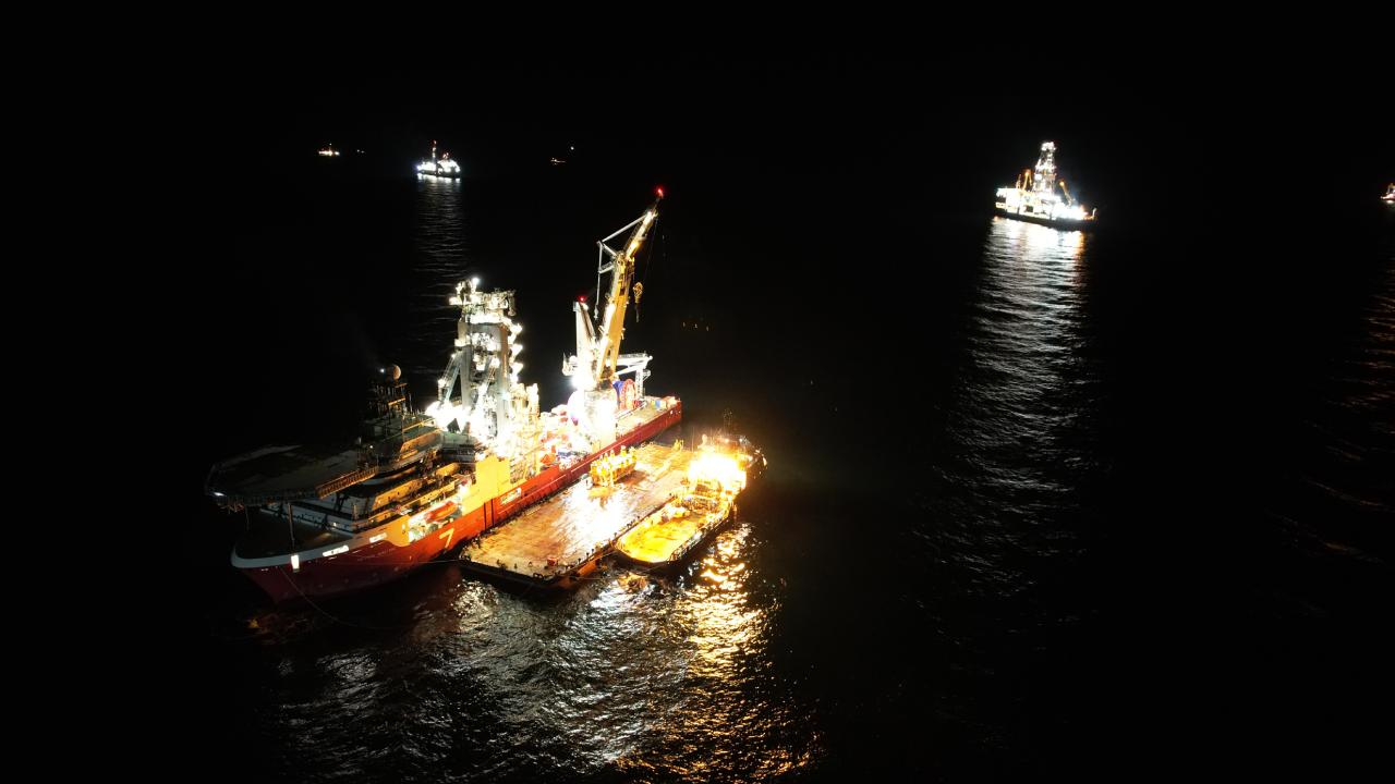 Ardından, Karadeniz gazını kuyulardan toplayıp ana boru hattına bağlayacak 280 tonluk dağıtım haznesi, limandan denize indirmenin yapılacağı Sakarya Gaz Sahasına gemiyle taşındı.