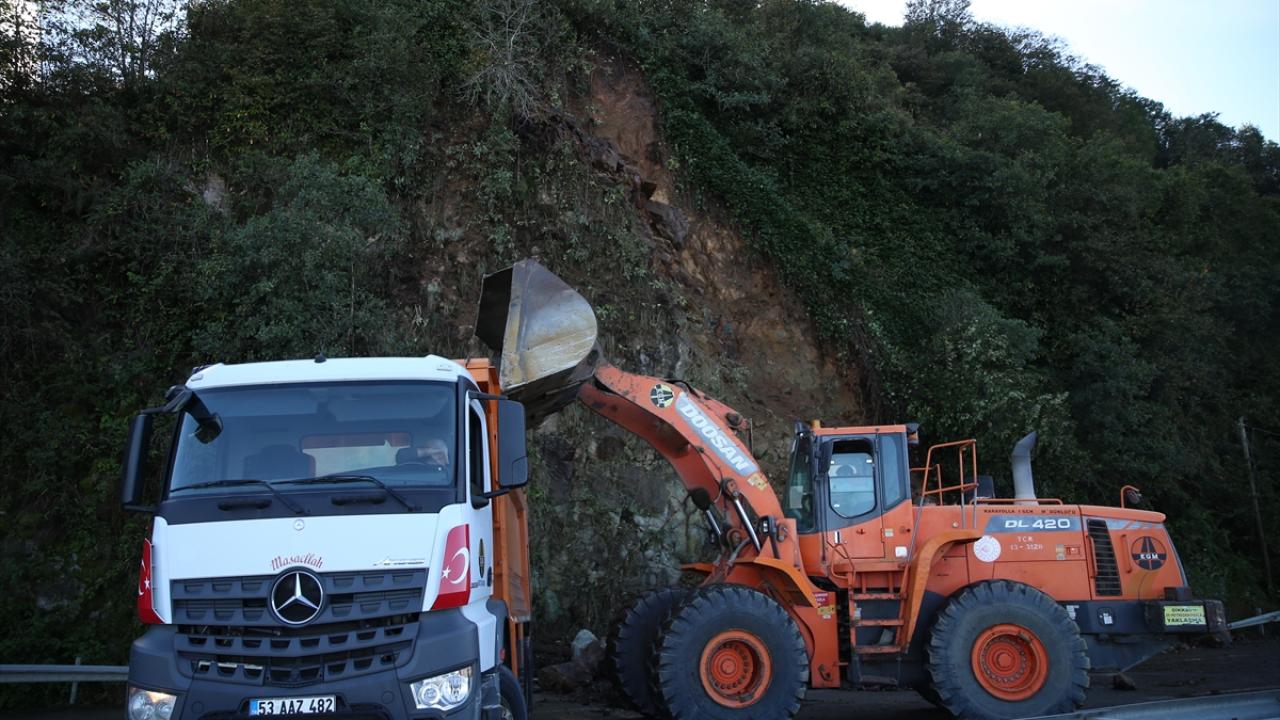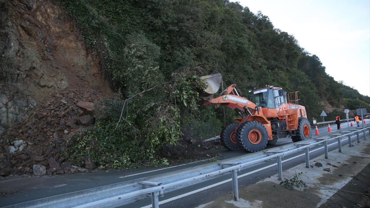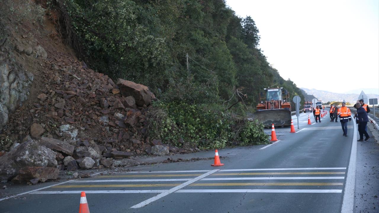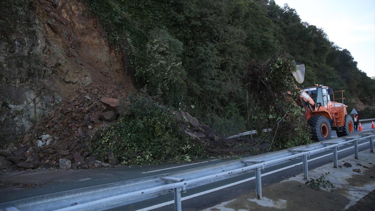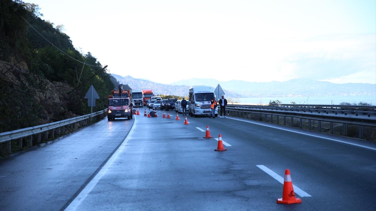 Ulaşımın tek şeritten kontrollü sağlandığı bölgede ekipler, yola düşen toprak ve kaya parçalarını kaldırmak için iş makineleriyle çalışmalarını sürdürüyor.