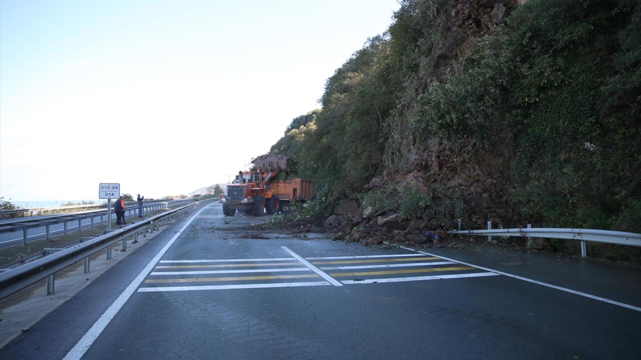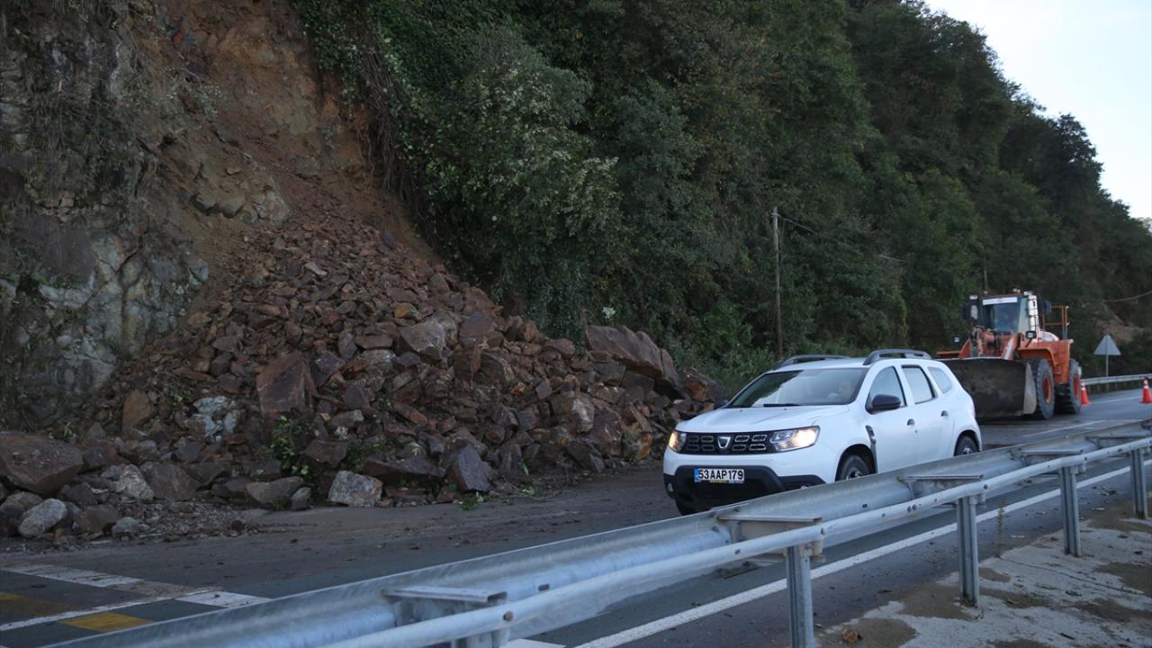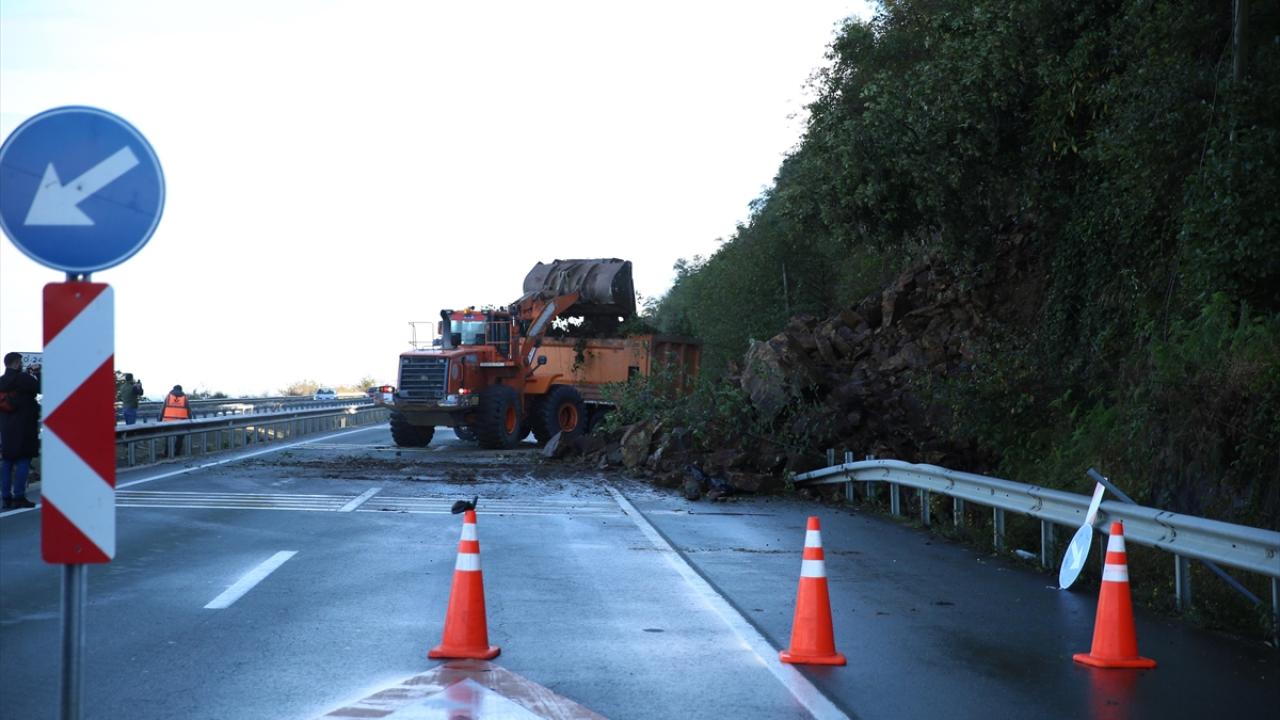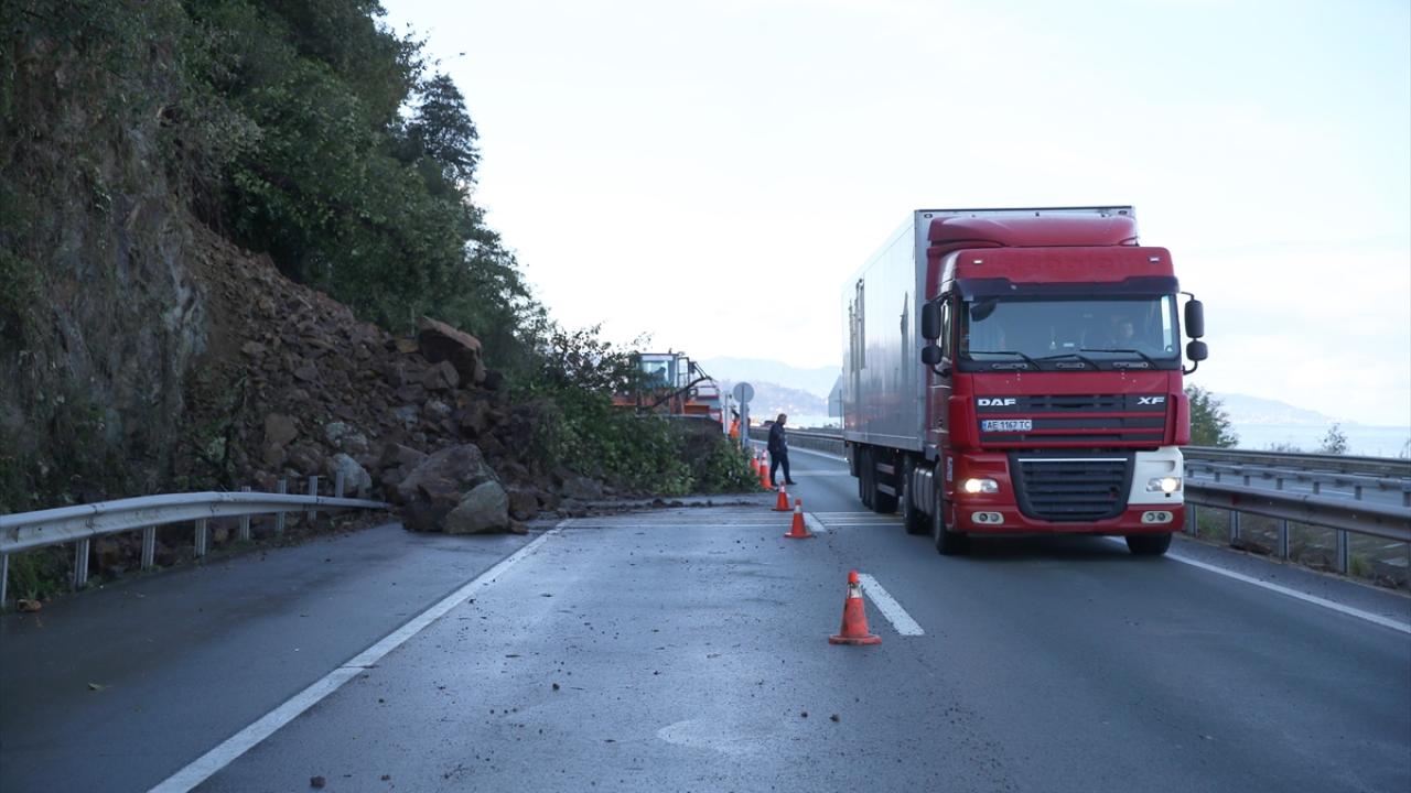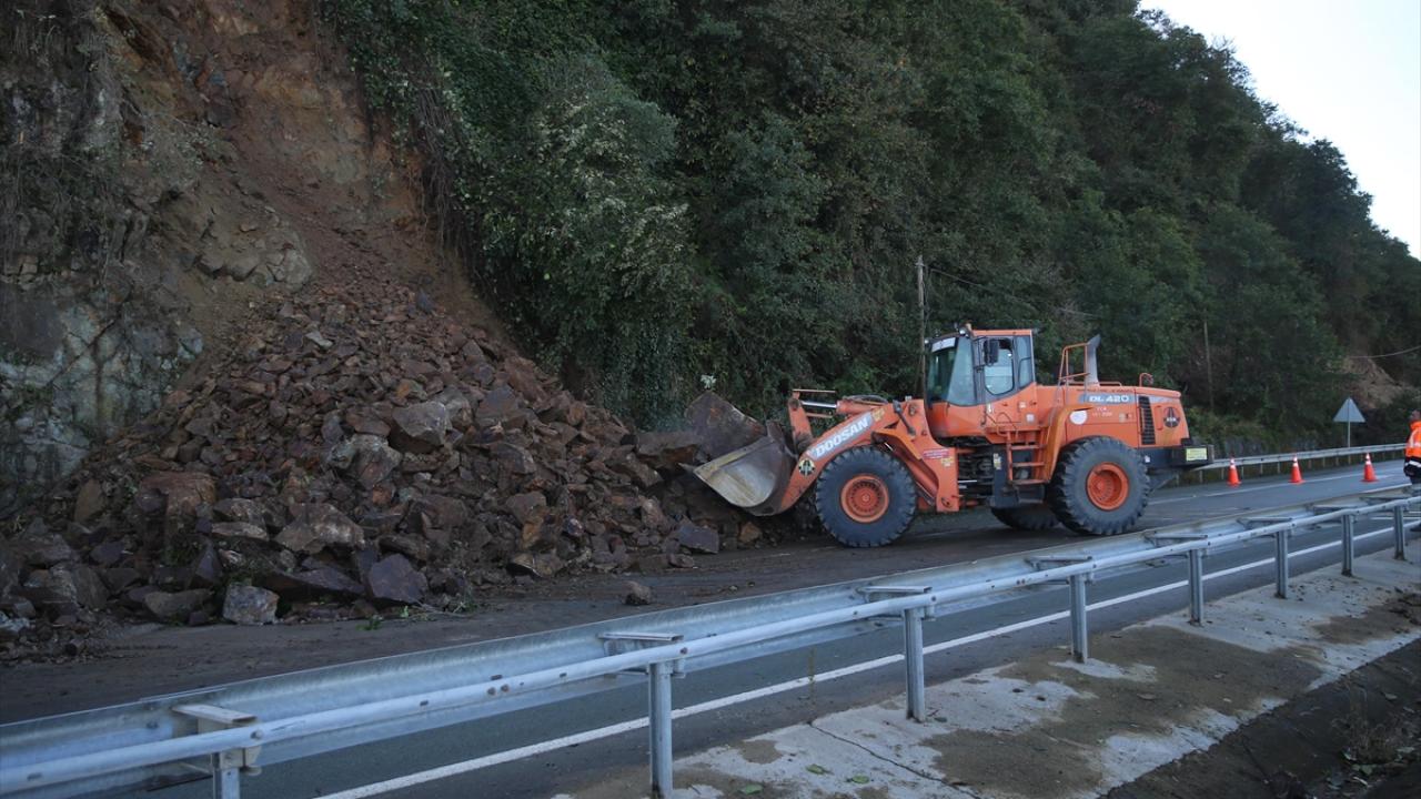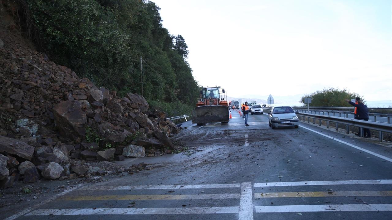 Ulaşımın tek şeritten kontrollü sağlandığı bölgede ekipler, yola düşen toprak ve kaya parçalarını kaldırmak için iş makineleriyle çalışmalarını sürdürüyor.