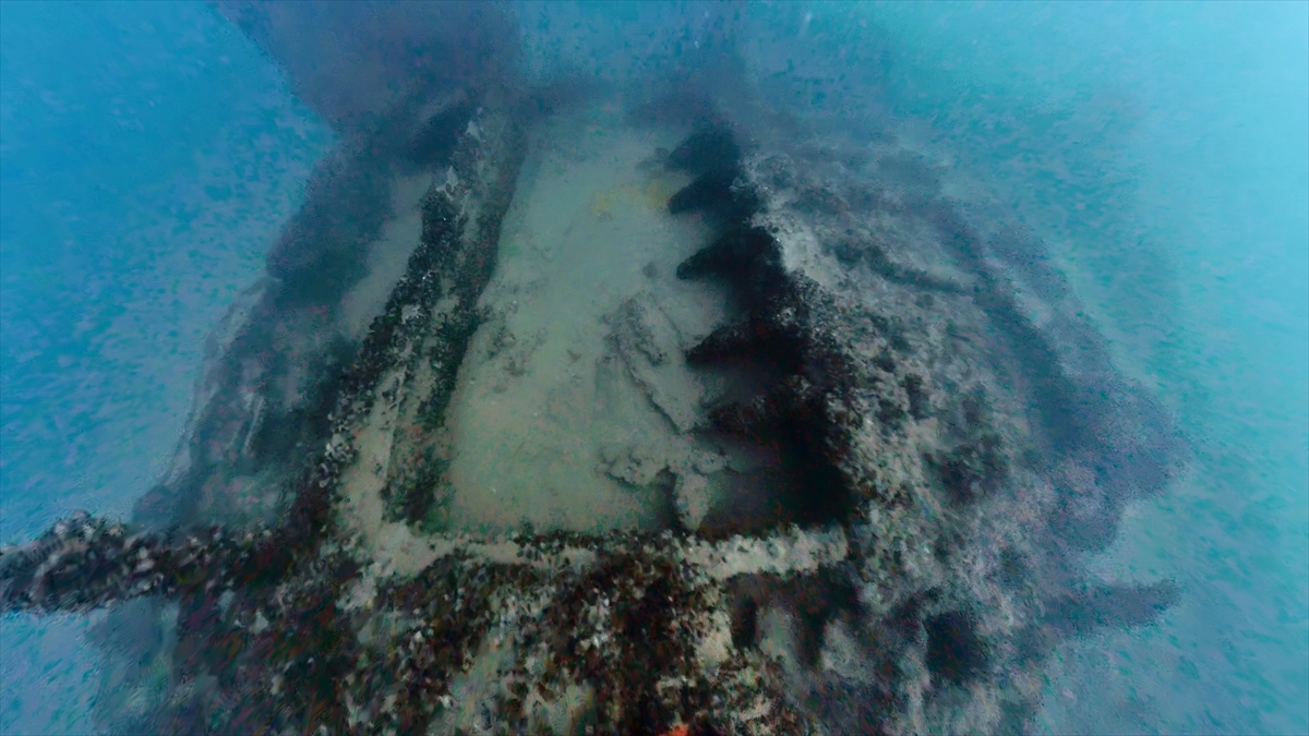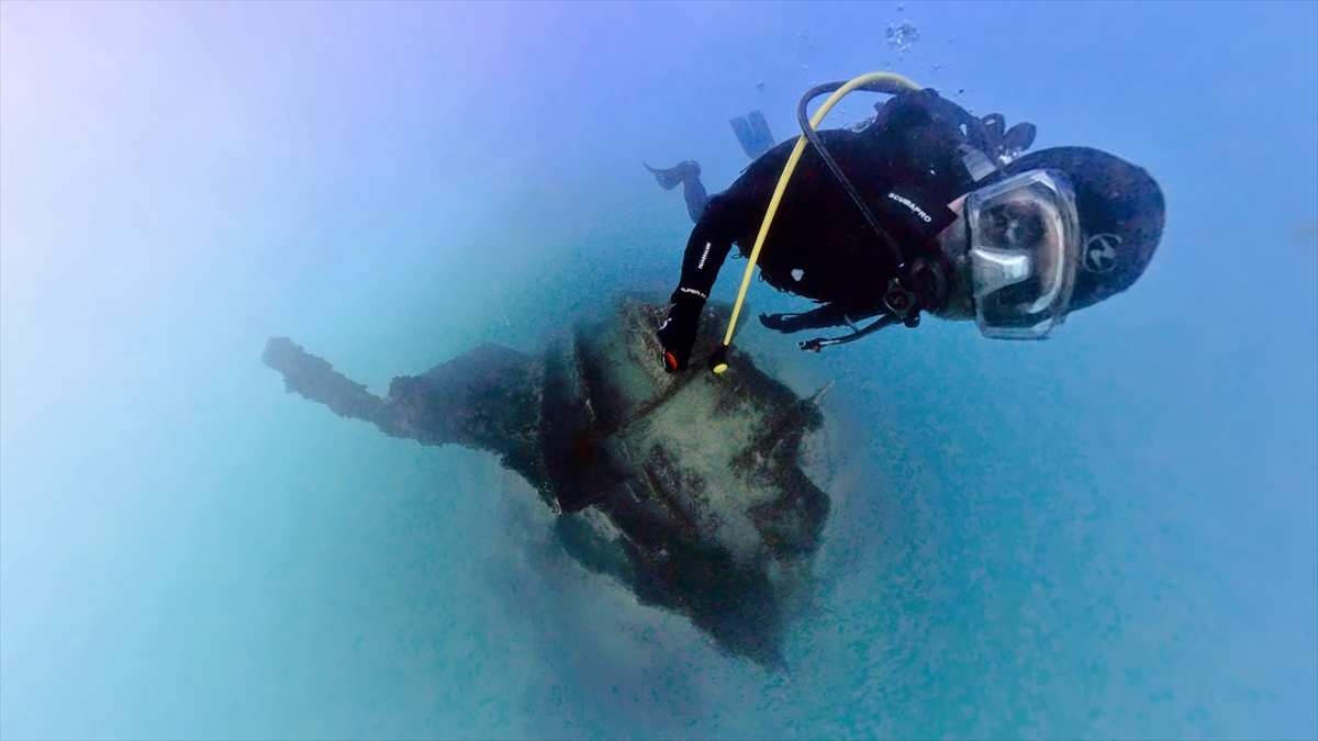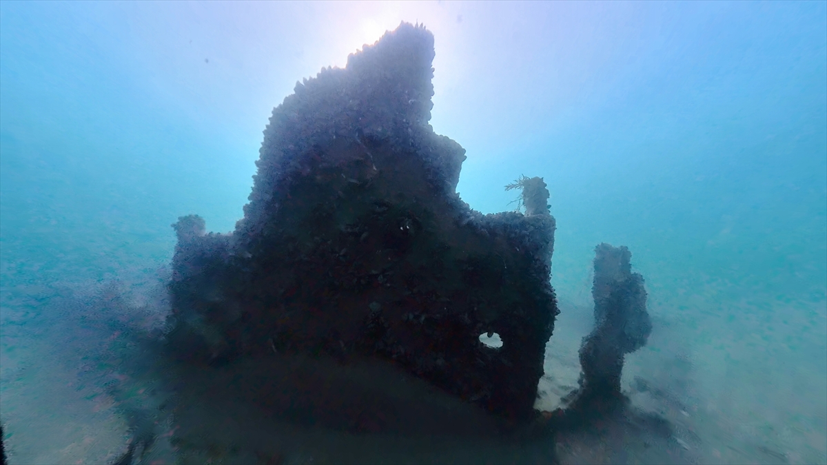 Karaburun açıklarında 8 ay önce su altı kamerası bağlı zıpkınla balık avına çıkan Gürkan Gürbüz, 6 metre derinlikte büyük demir kalıntıları olduğunu gördü.