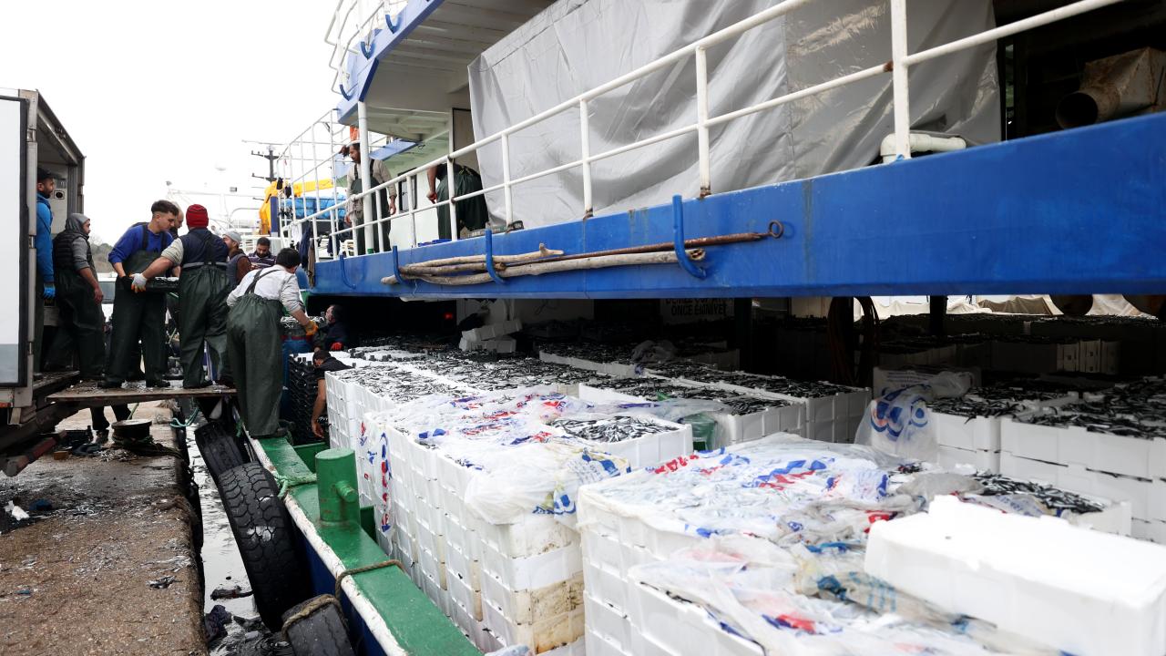 Bol miktarda hamsi avlayan ve yükleri nedeniyle limana giremeyen bazı tekneler ise hamsileri küçük balıkçı tekneleriyle limana getirdi.