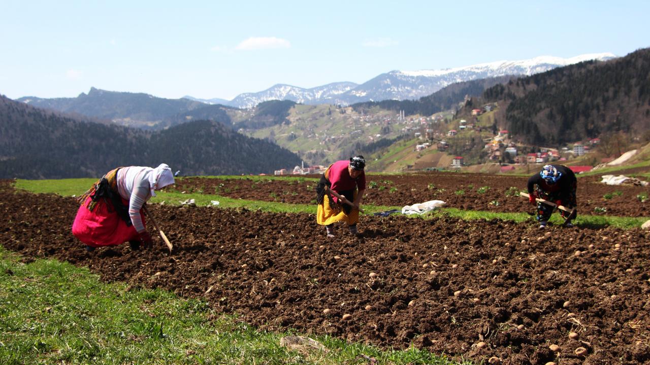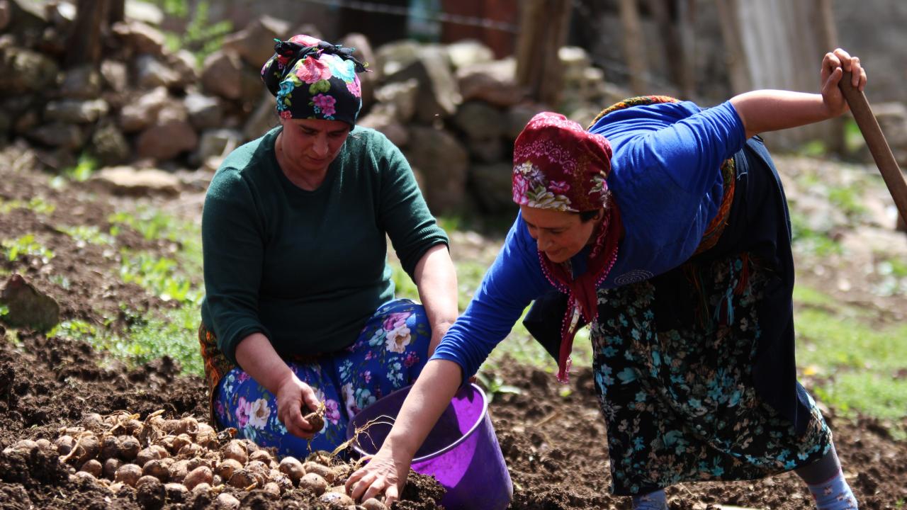 Çocuklarını da yanlarına alarak ailece tarlaya inen kadınlar, genelde patates ekiyor.