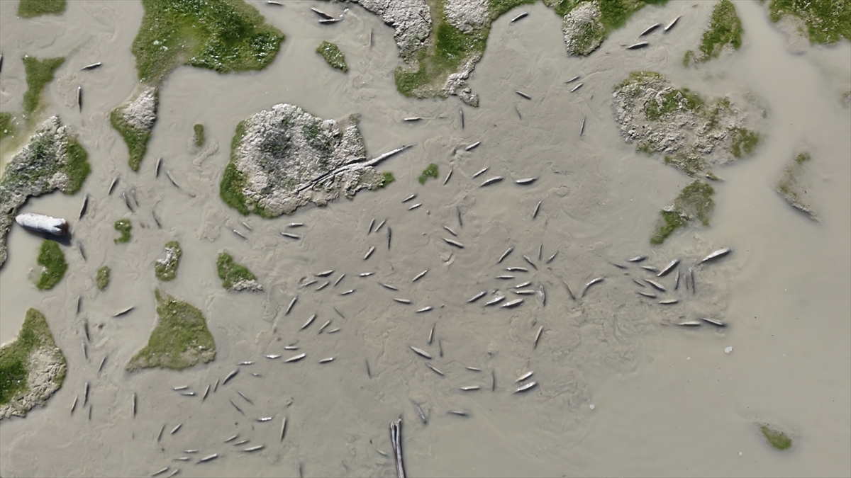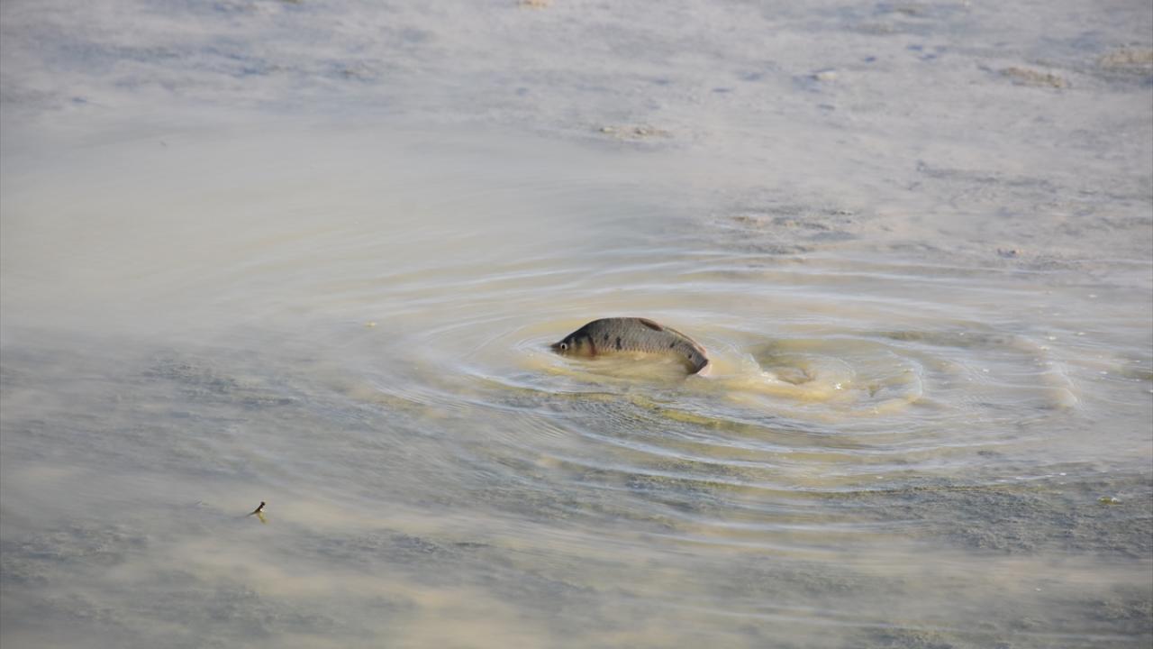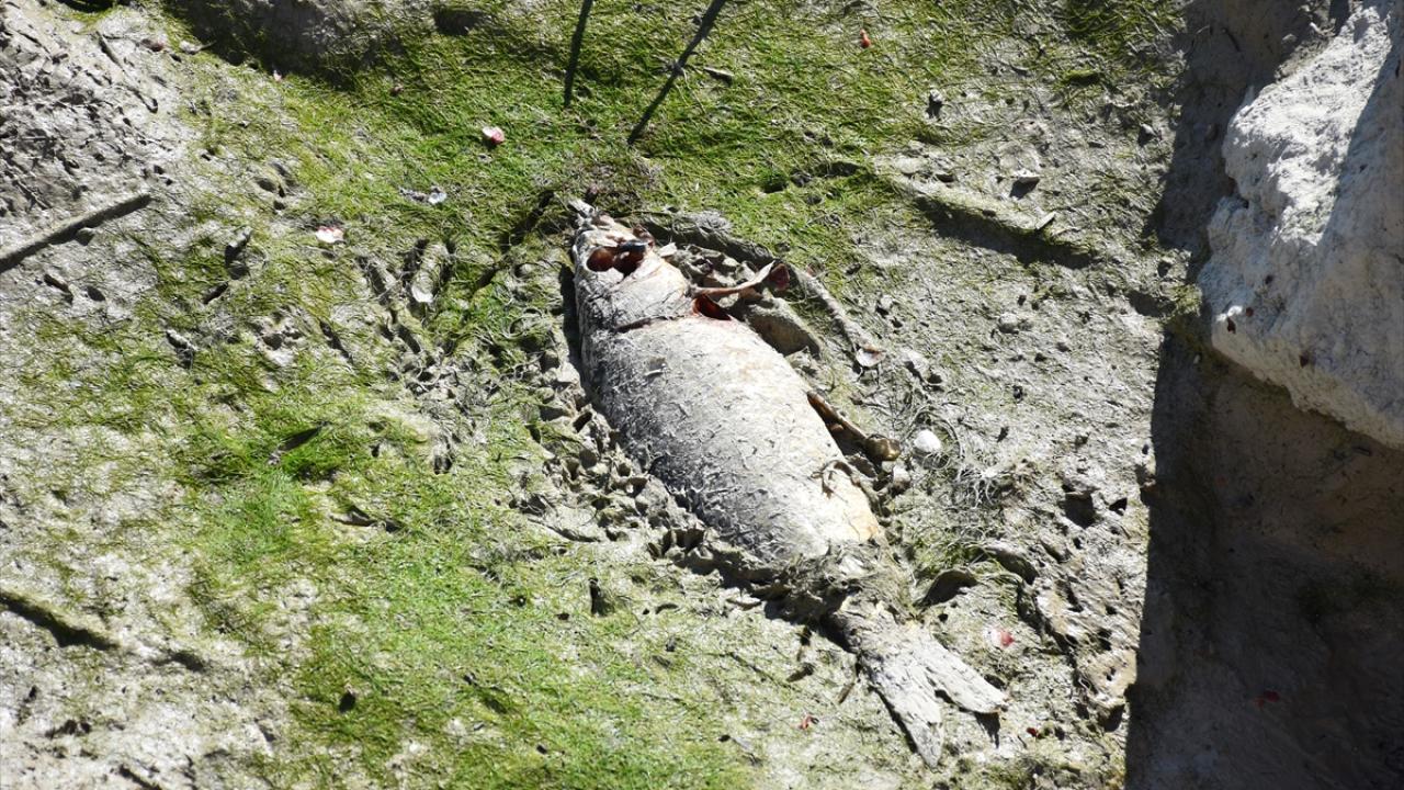 Büyük bölümü kuruyan barajda oksijensiz kalan balıkların bir kısmı su birikintilerinde mahsur kalırken, bir kısmı da telef olarak kıyıya vurdu.