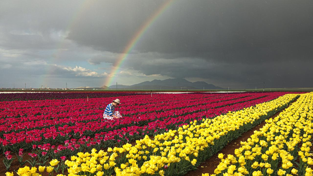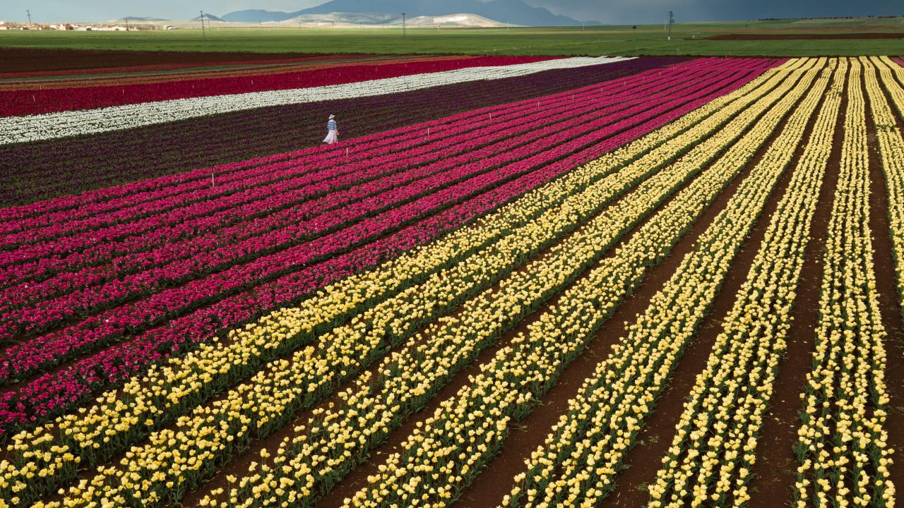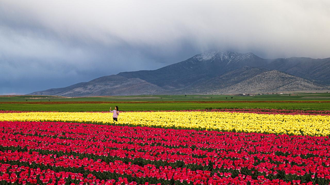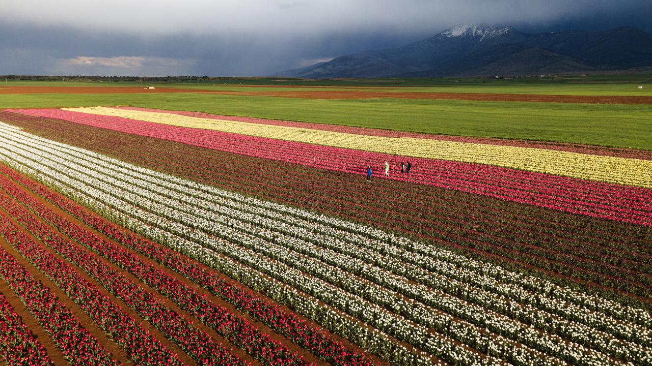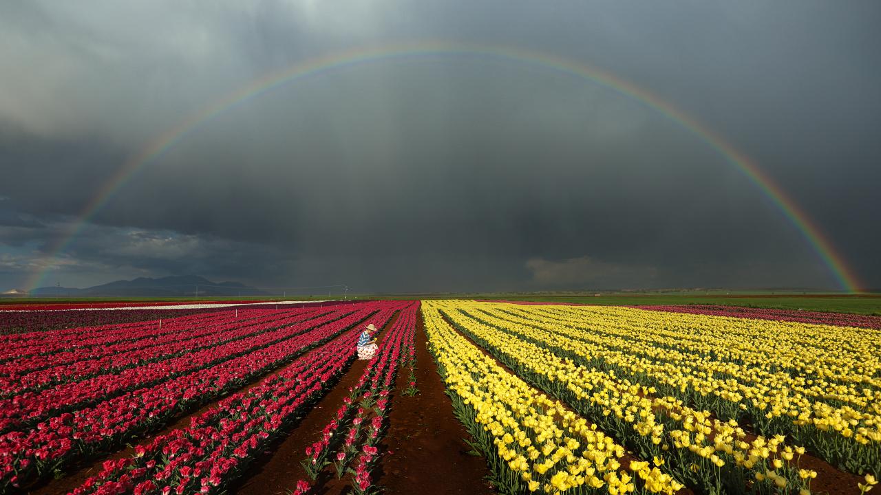 Lalelerin açmasıyla yeryüzünde bir gökkuşağını andıran 50 dekarlık bahçe, bu yıl ziyaretçilere kapısını 15 Nisan`da açtı.