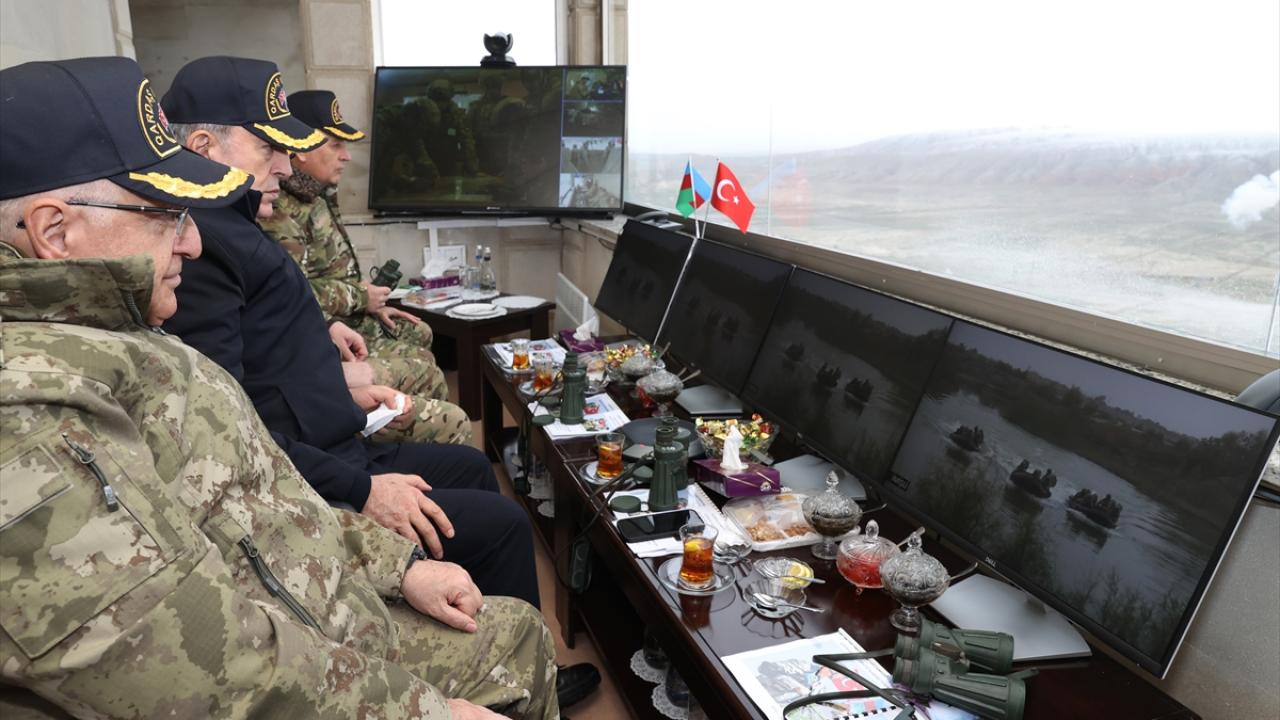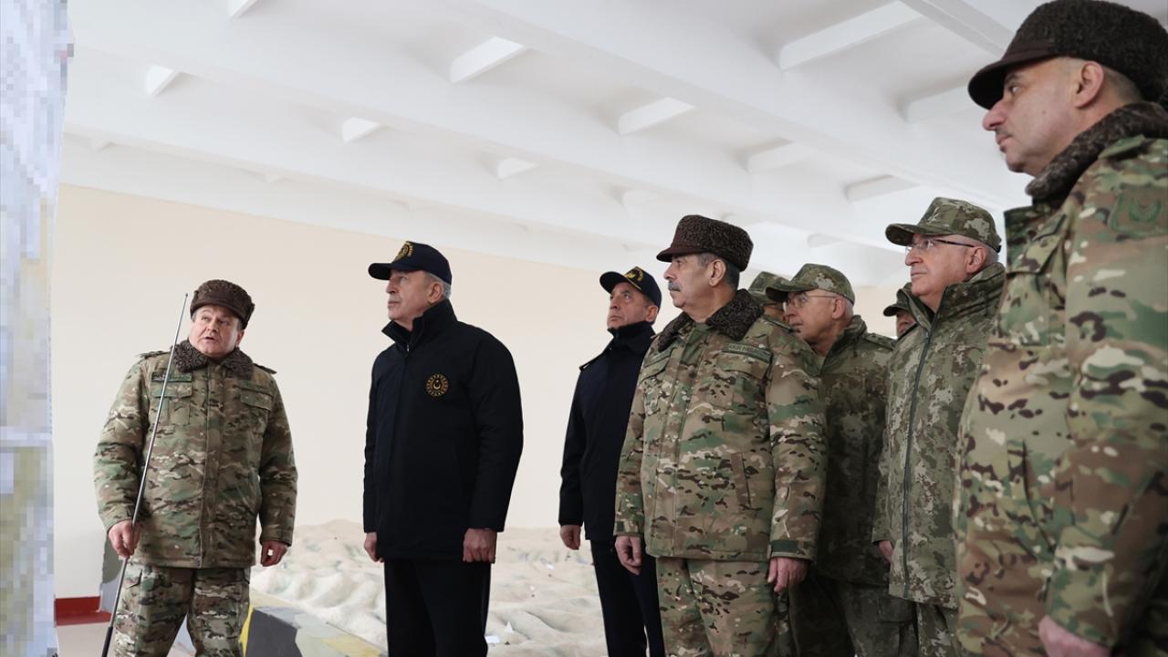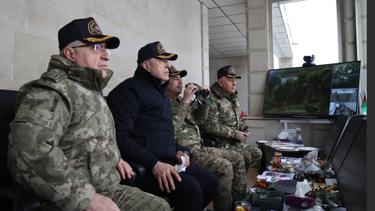 Tatbikata ilişkin brifing alan bakanlar Akar ve Hasanov beraberindeki komutanlarla seyir yerine geçti.