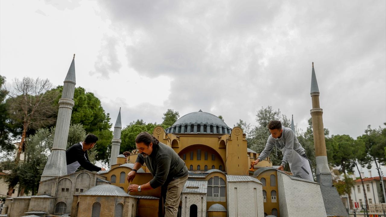 Kaya, çalışmalarda poliüretan ve polyester kullandıklarını belirterek, "Malzemeleri tutturmak için de vida ve tutkal tercih ediyoruz. Sembol bir mimari eserin önemli bir parçasını tutkalla tutturmak bazen bana da garip geliyor. `Ayasofya`yı iki haftada tutkalla, vidayla restore ettim.` dediğimde inanmayıp dalga geçiyorlar. Minyatür olduğunu söyleyince bir gülümseme oluyor, dikkatlerini çekiyor. Burada çalışırken hep bu eserlerin asıllarını yapanları düşünüyor, hayran kalıyorum. Minareleri söküp tamir ederken çok uğraşıp emek veriyoruz." ifadelerini kullandı.