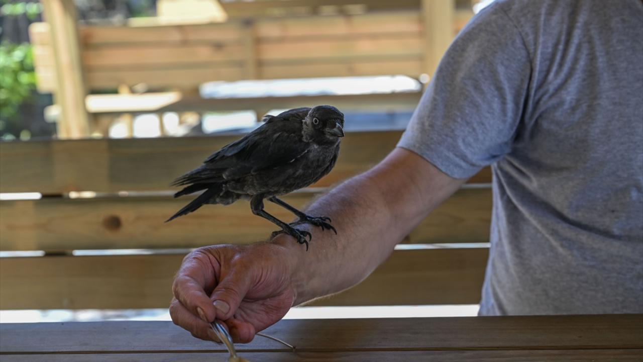 Silivri’de kahvehanesine gelen ve dükkan sahibi Tacettin Şeker’in yanından ayrılmayan karga görenlerin ilgisini çekiyor.