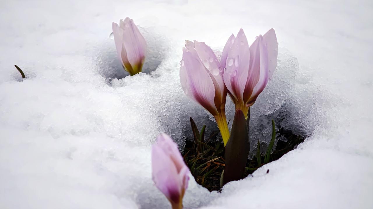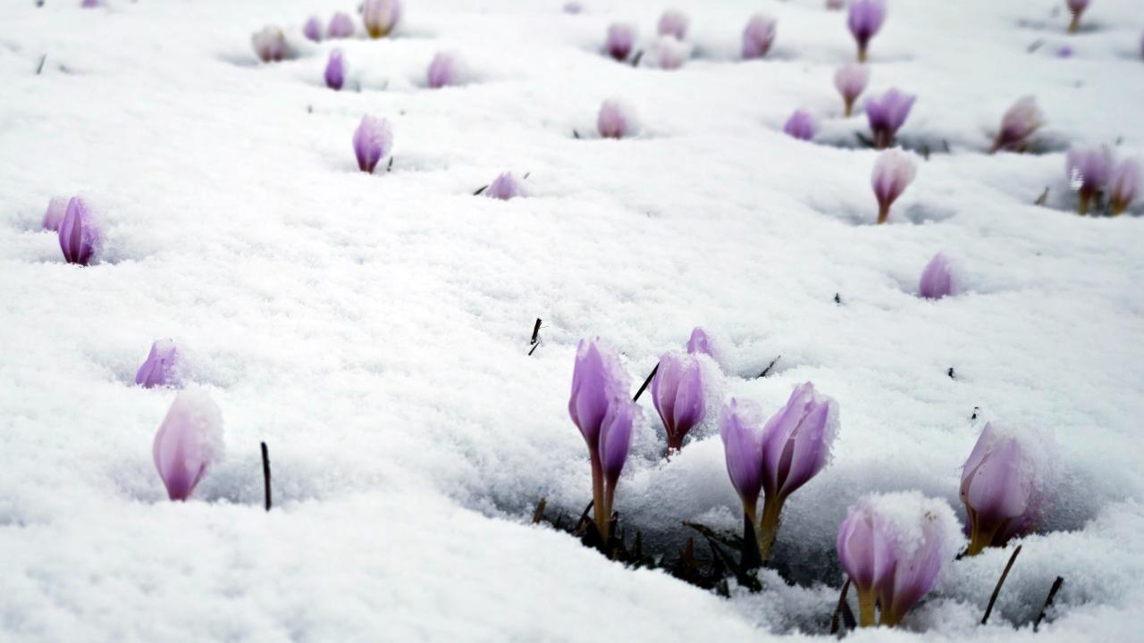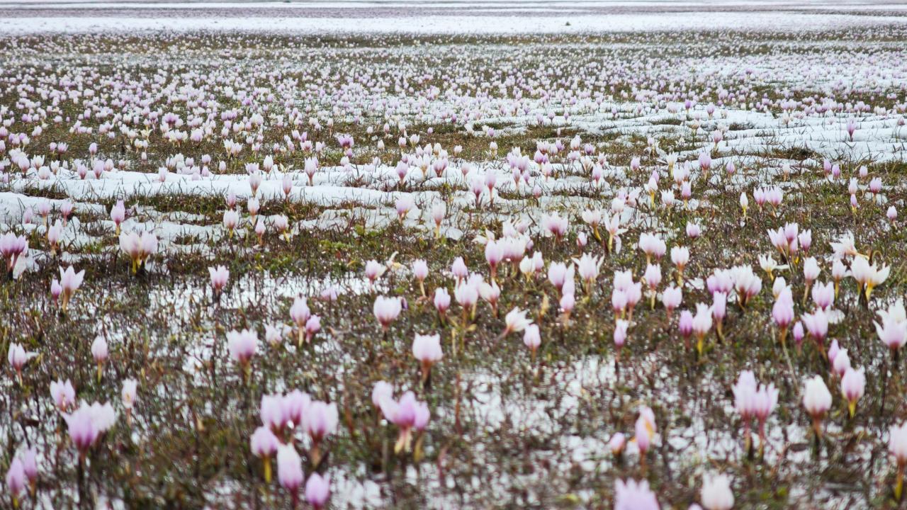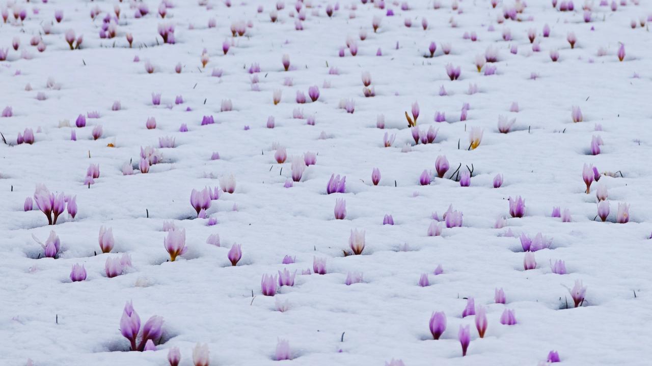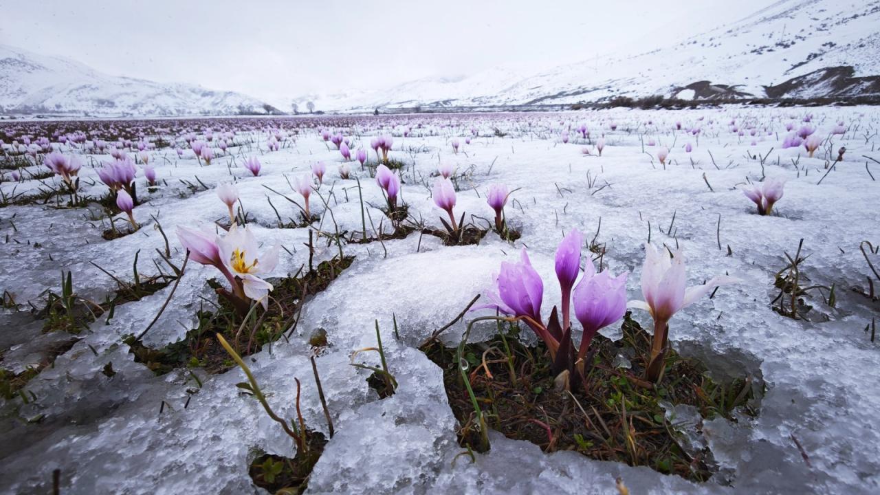 Kar altında kalan beyaz, pembe ve mor renkteki çiğdemler, ortaya hayranlık uyandıran görüntüler çıkardı.