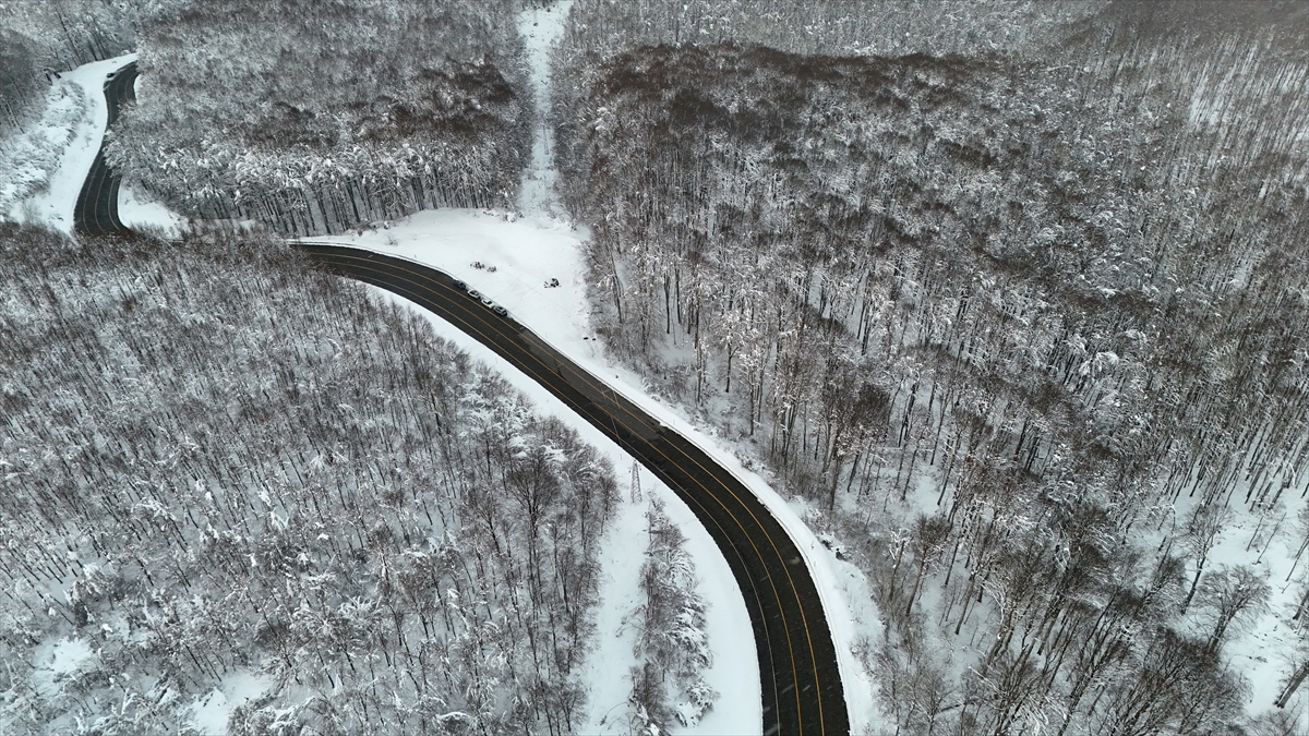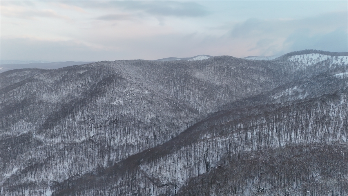 Kırklareli'nin yüksek kesimlerinde etkili olan kar yağışıyla beyaza bürünen Istranca Ormanları dronla görüntülendi.