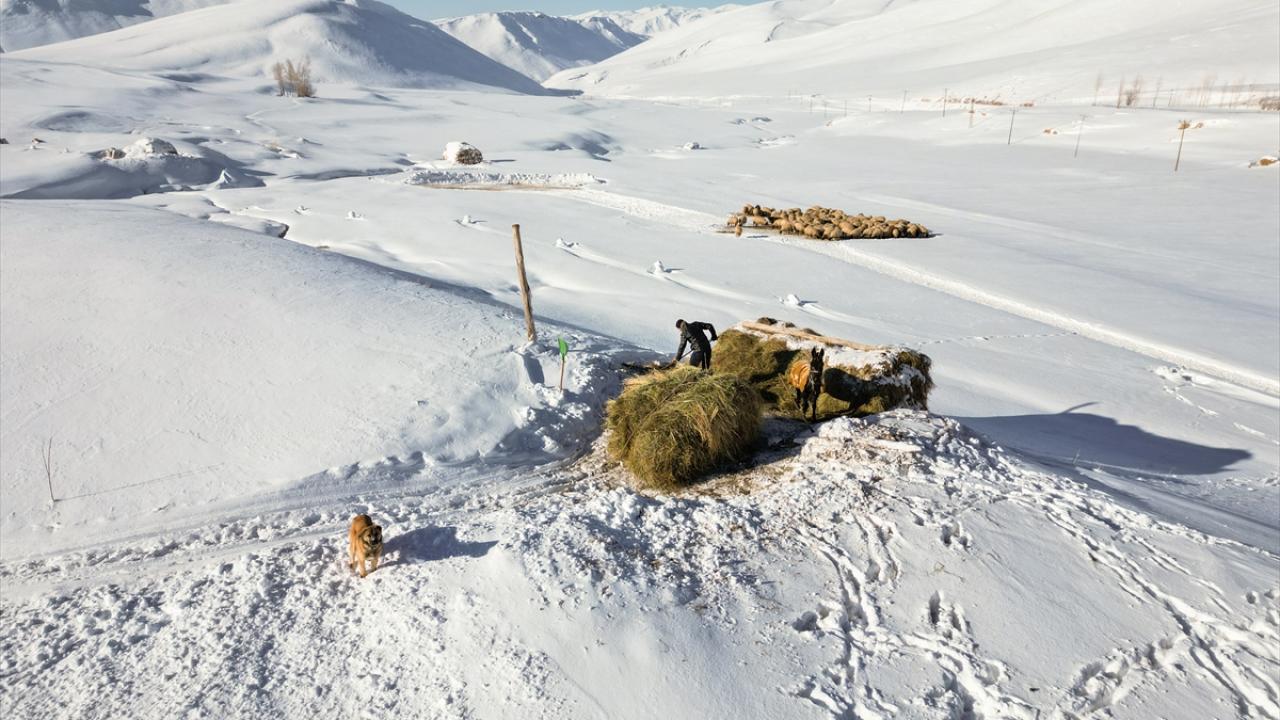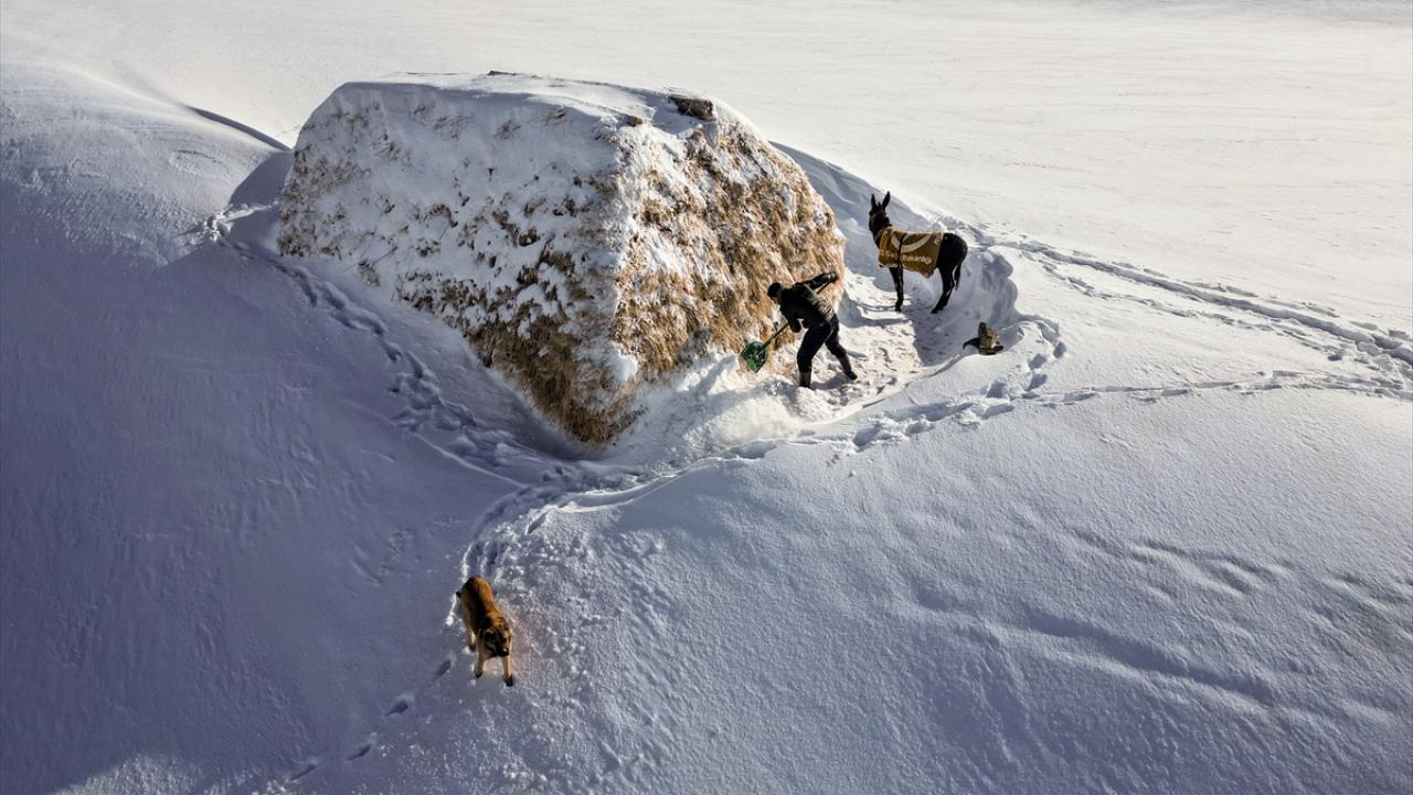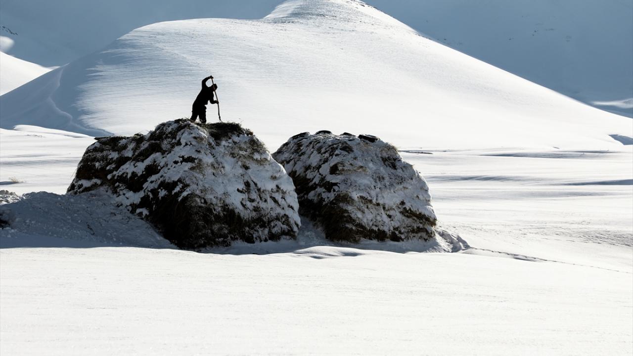 Karla kaplı köylerinde günün büyük bölümünü hayvanlara ayıran besiciler, yazın istifledikleri ot, yonca ve samanı kar tabakasının altından çıkarıyor.
