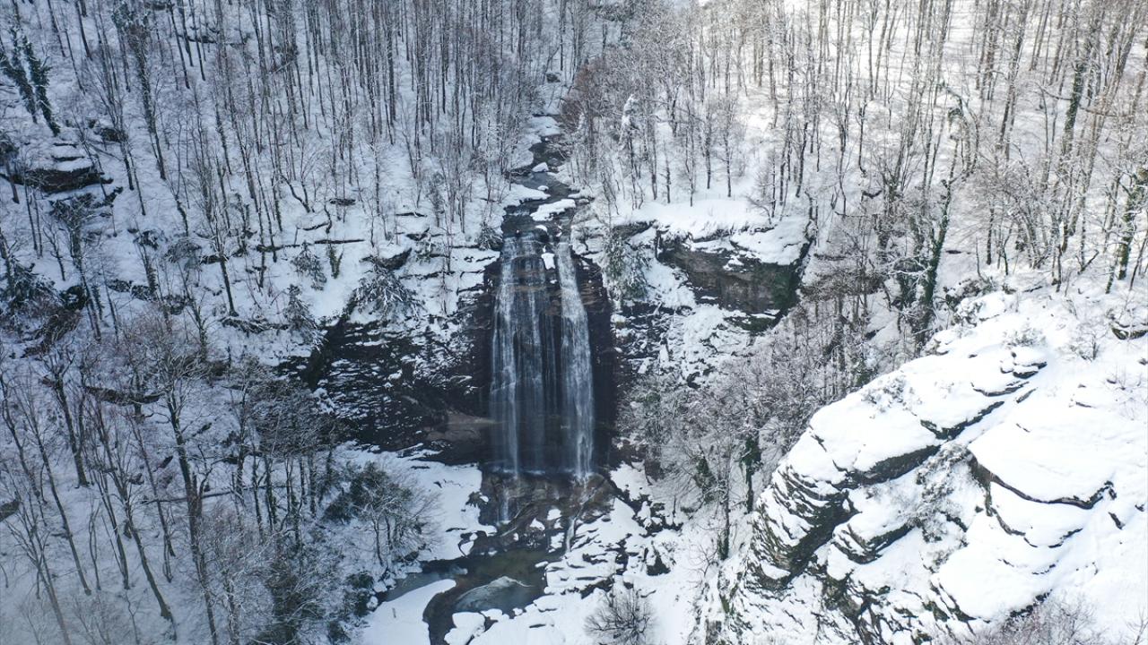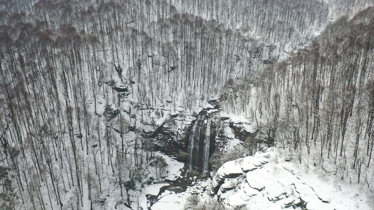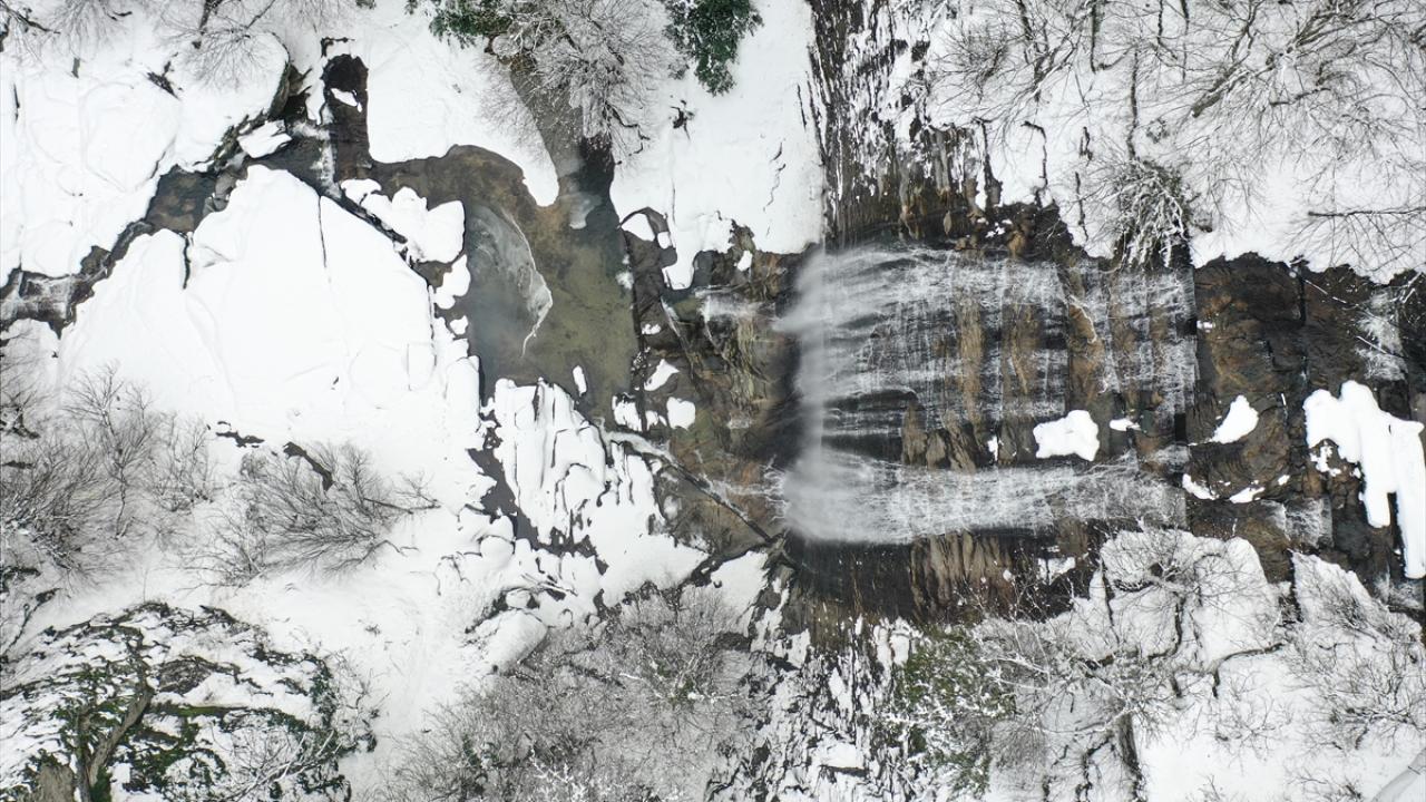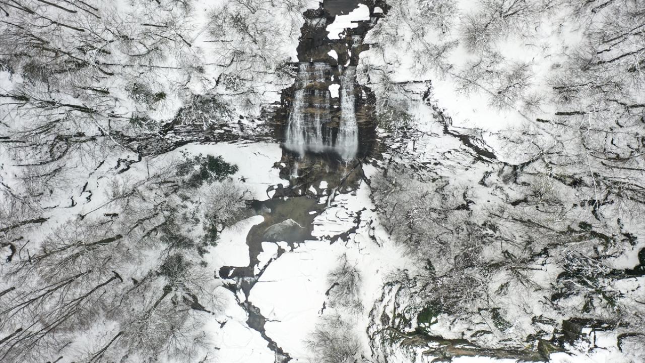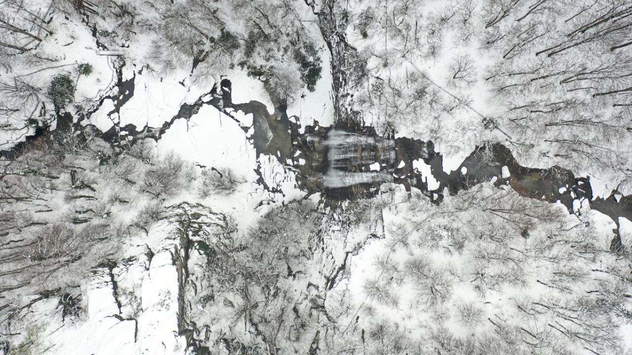 Karla kaplı Suuçtu Şelalesi'nin çevresi dronla görüntülendi