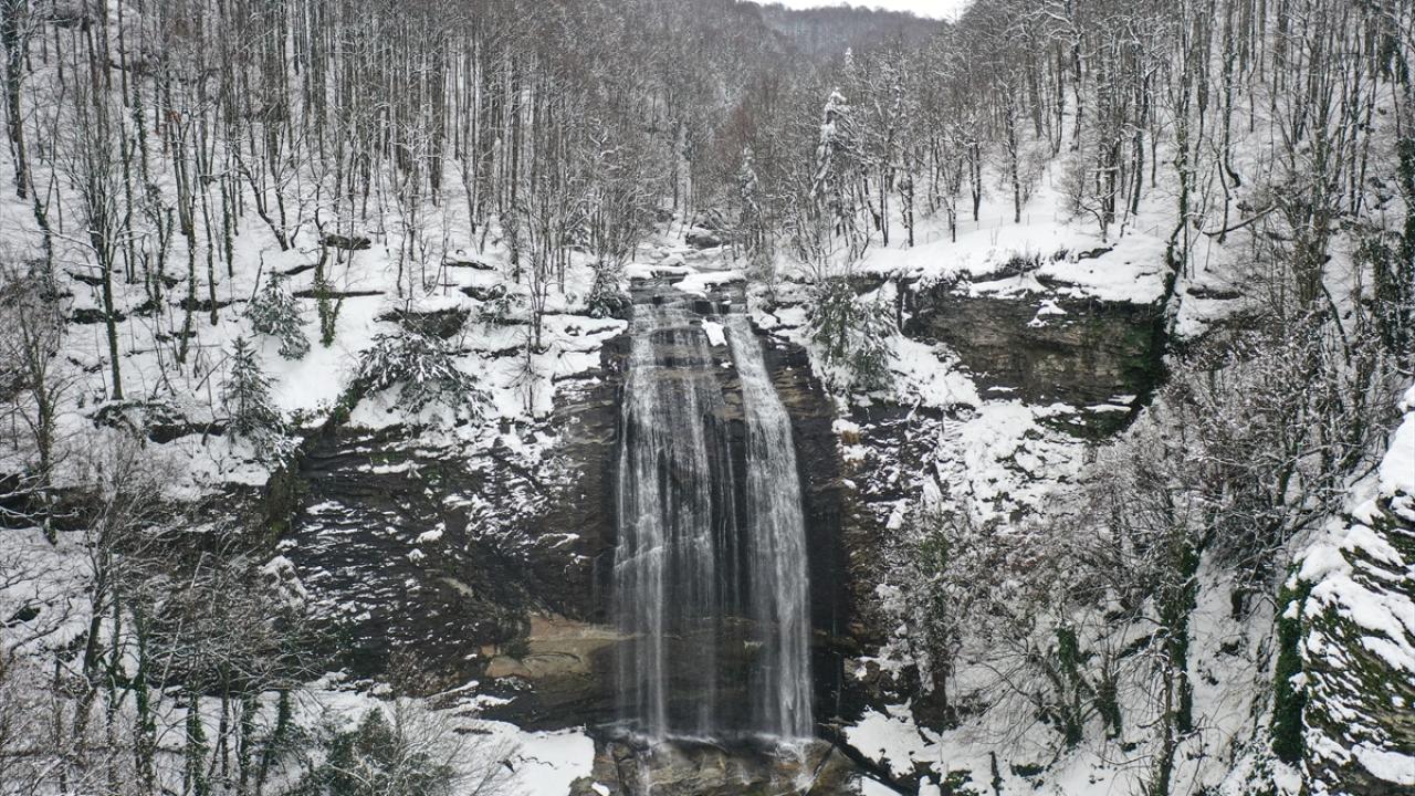 Kar örtüsünün arasından süzülen Suuçtu Şelalesi ve çevresi dronla görüntülendi.