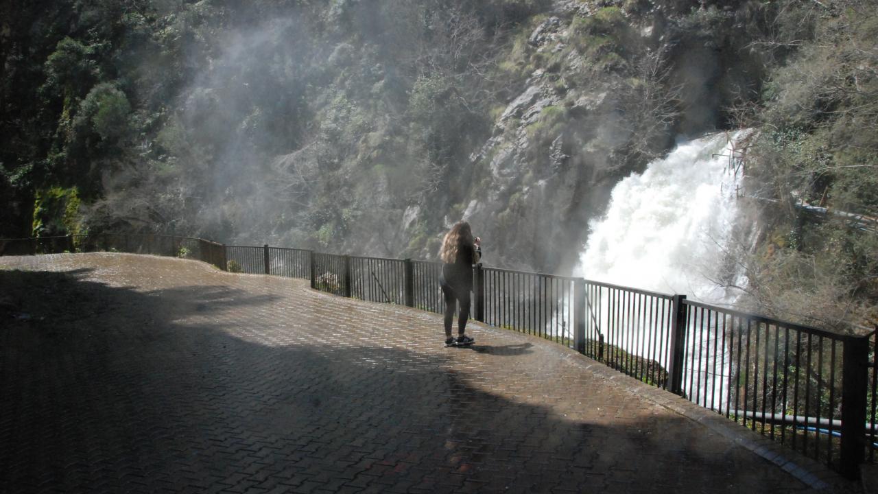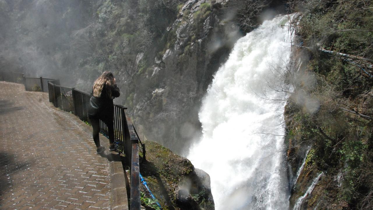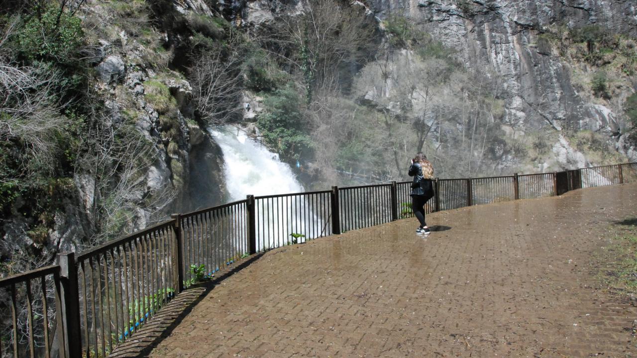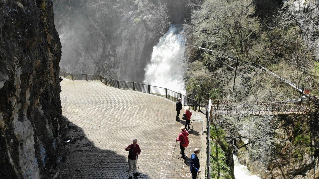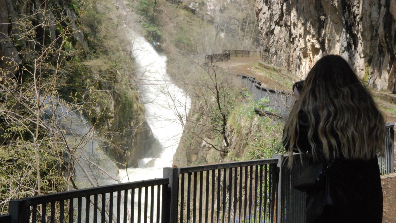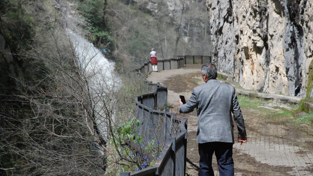 Kaya oyuğunun içinden kanyona akan suyun, havaya yükselen su buharıyla oluşturduğu görüntü, seyrine doyumsuz bir manzara ortaya çıkarıyor.