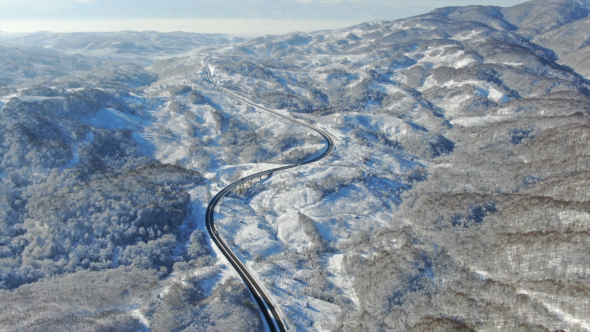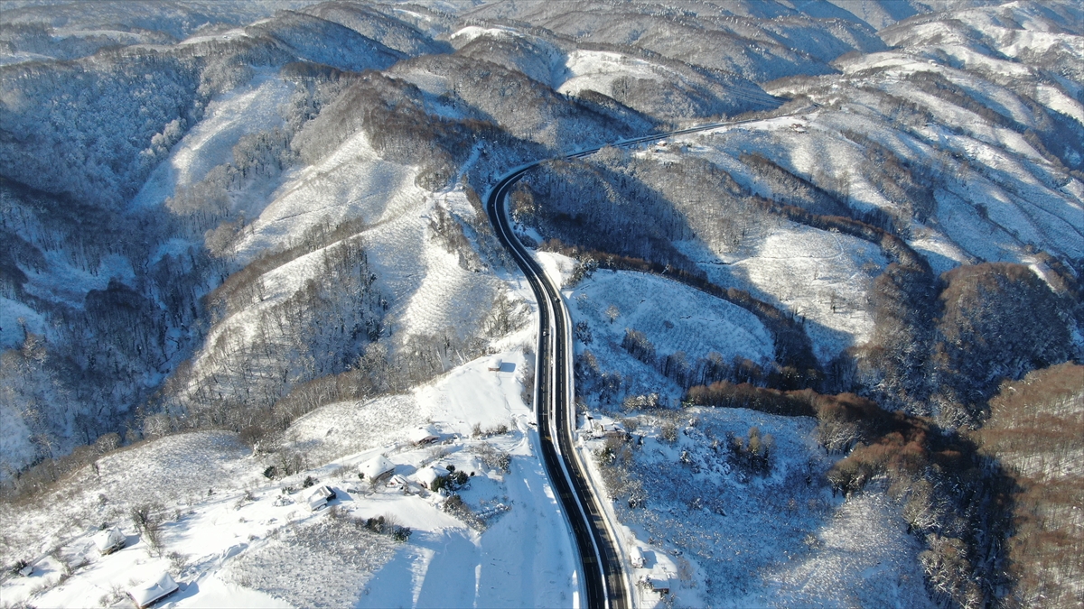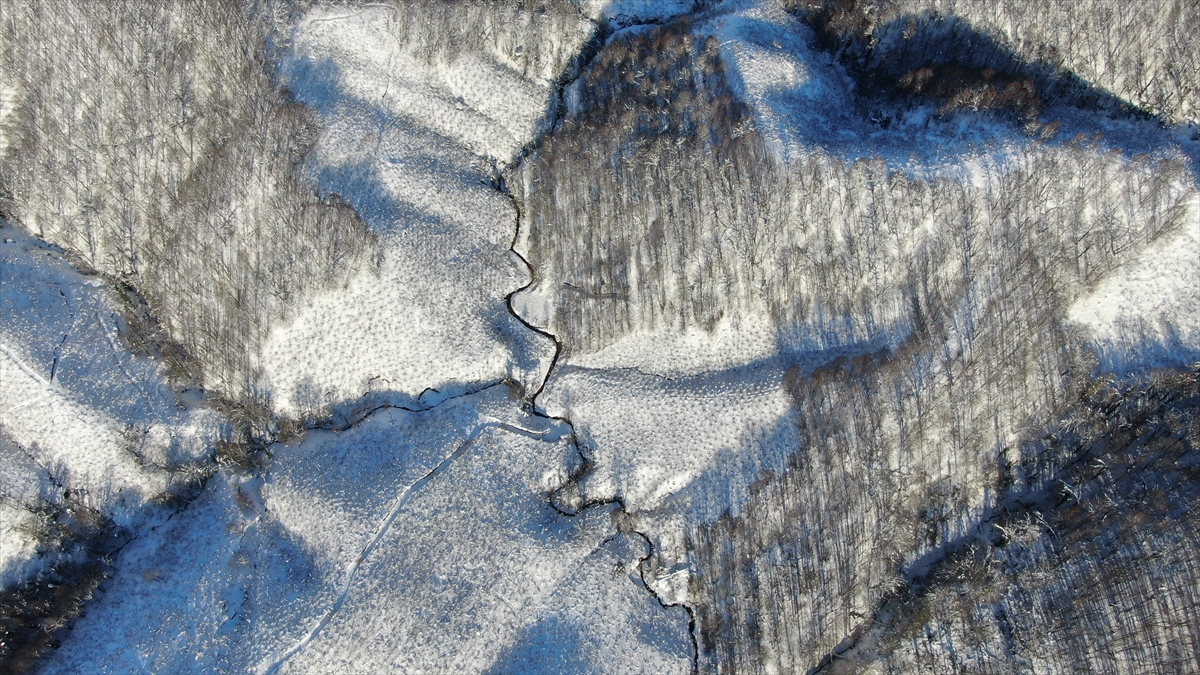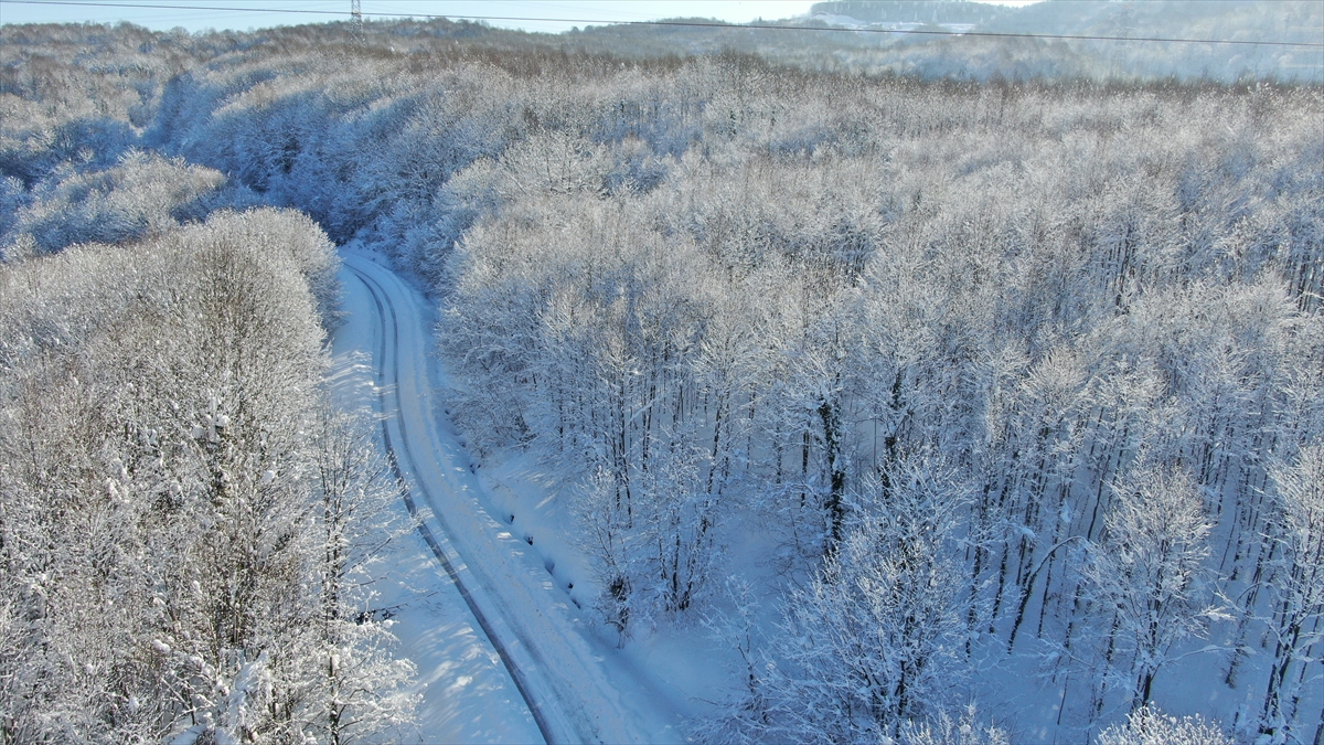 Deniz ve karla kaplı ormanın birleştiği ilçe havadan görüntülendi.