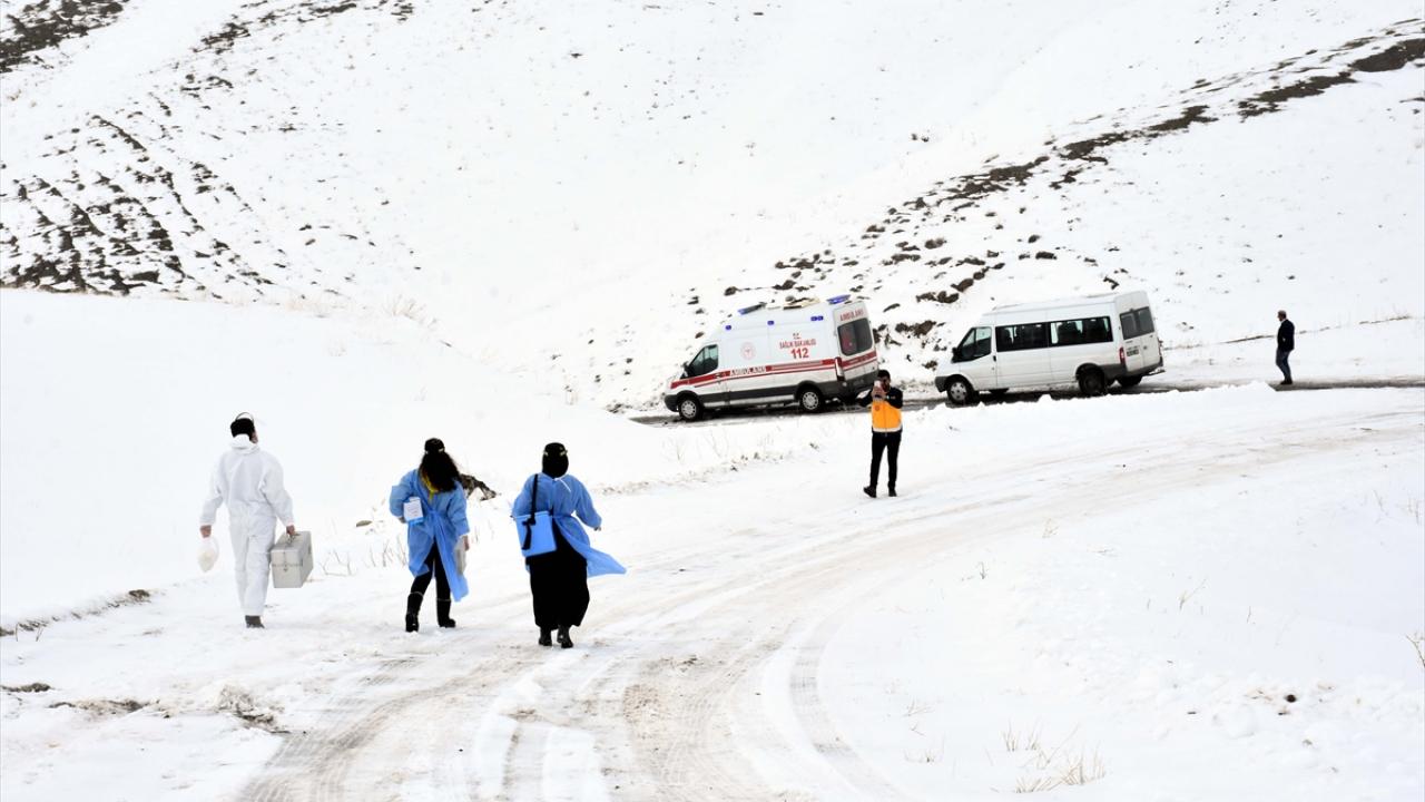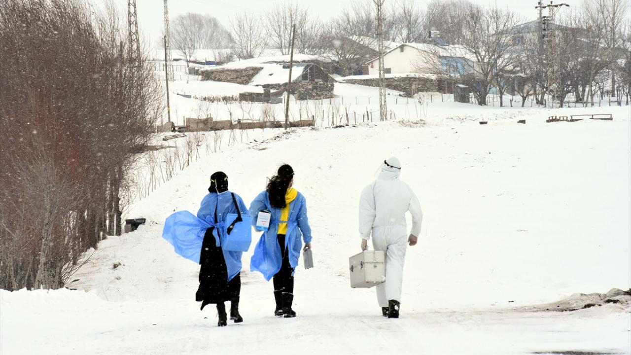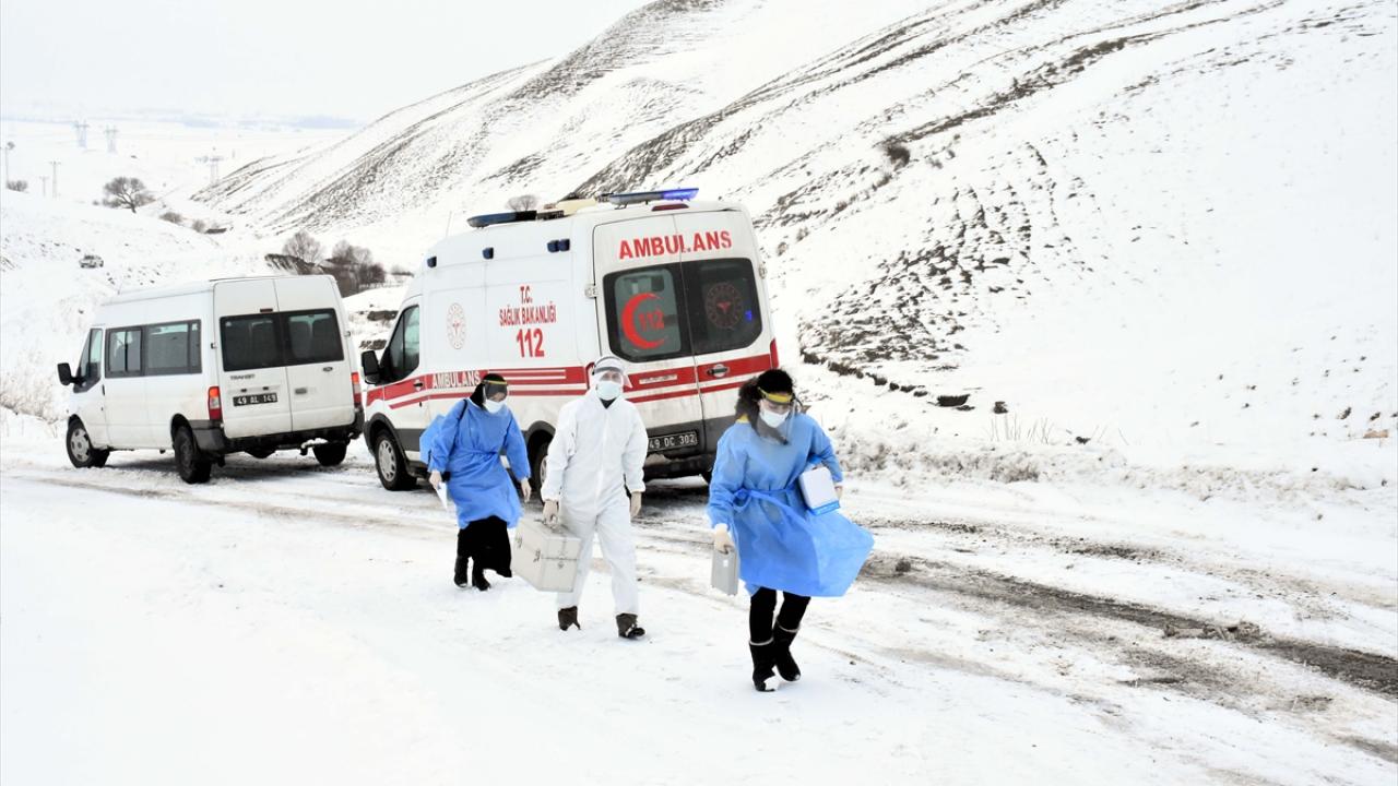 Yolda kar nedeniyle araçlarla ilerleyemeyen sağlık ekipleri; fırtına, tipi ve dondurucu soğuğa rağmen 2 kilometre yürüyerek mezraya ulaştı.