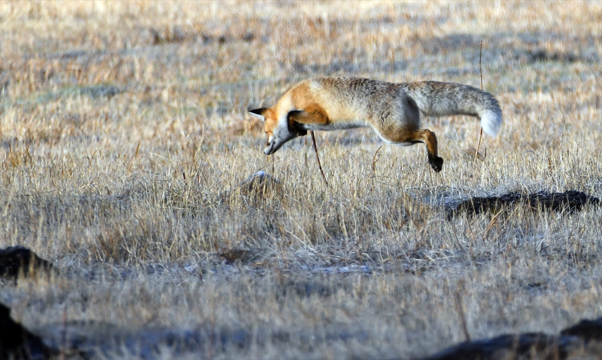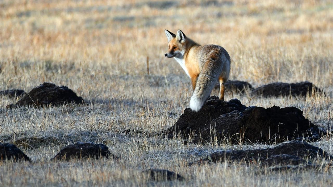 Arazide dolaşan kızıl tilkinin fare avına çıkması ve kuşların yiyecek araması görüntülendi.