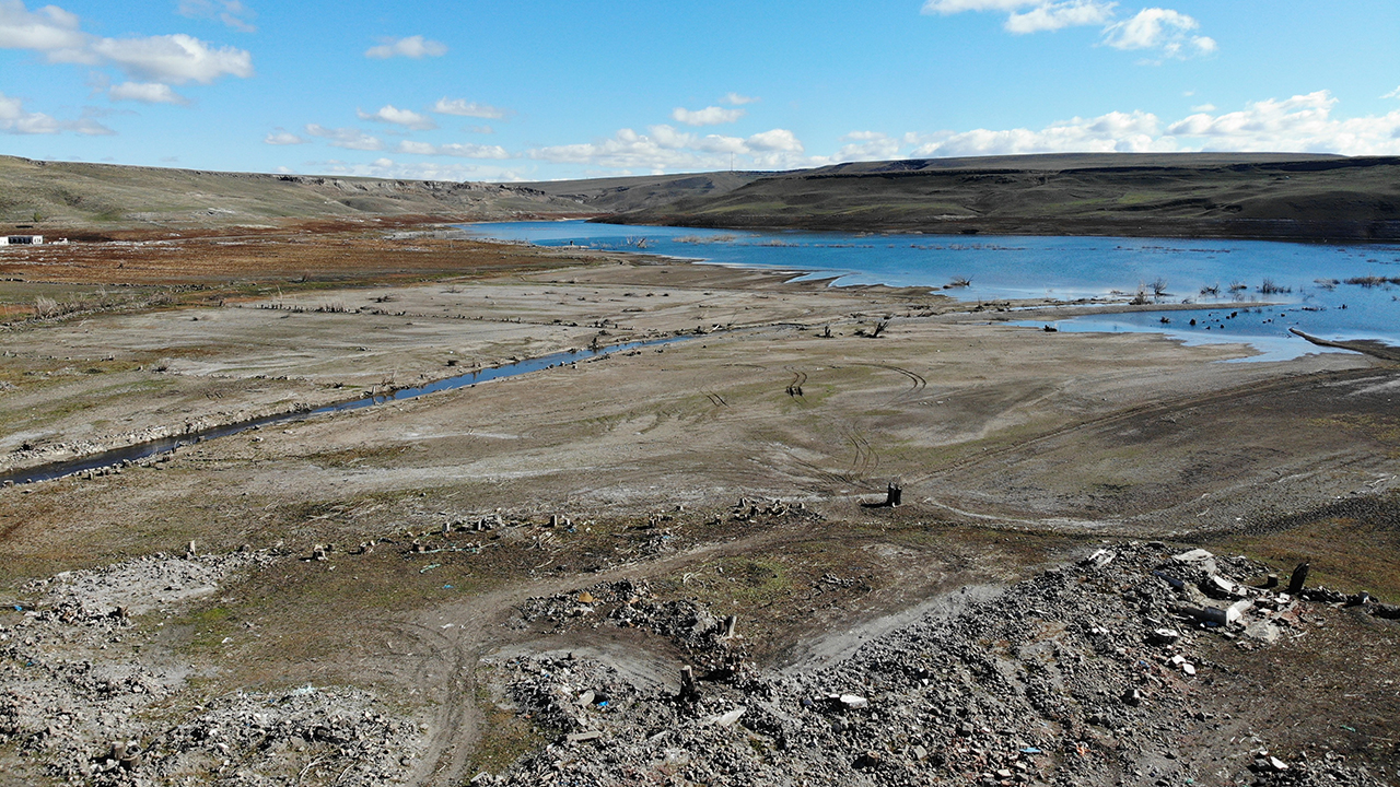 Kars Baraj Gölü’nün su ihtiyacını karşılayan Kars Çayı’nın de debisinin düşmesiyle baraj gölü suları altında kalan eski yerleşim yerlerinin kalıntılarını da ortaya çıkardı.