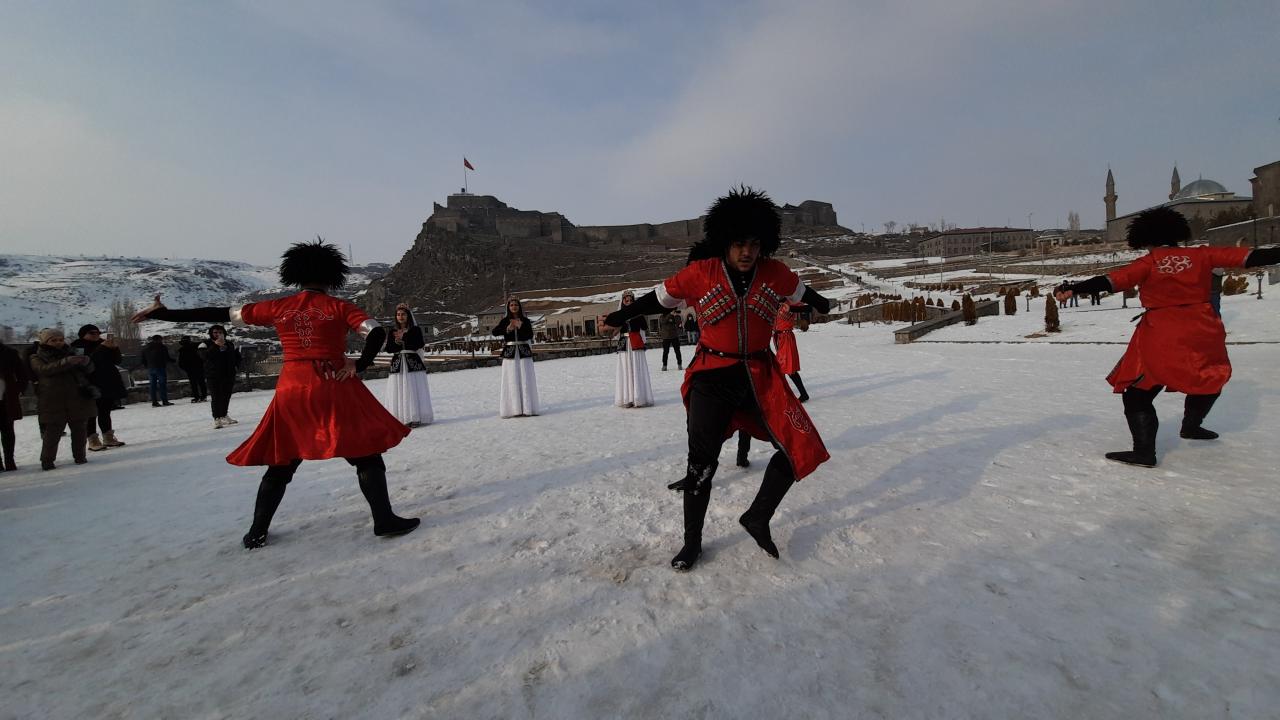 Kış mevsiminde başka bir güzelliğe bürünen Kars, misafirlerini ağırlamaya devam ediyor. Turistik Doğu Ekspresiyle kente gelen turistler Kafkas dansıyla karşılanıyor.