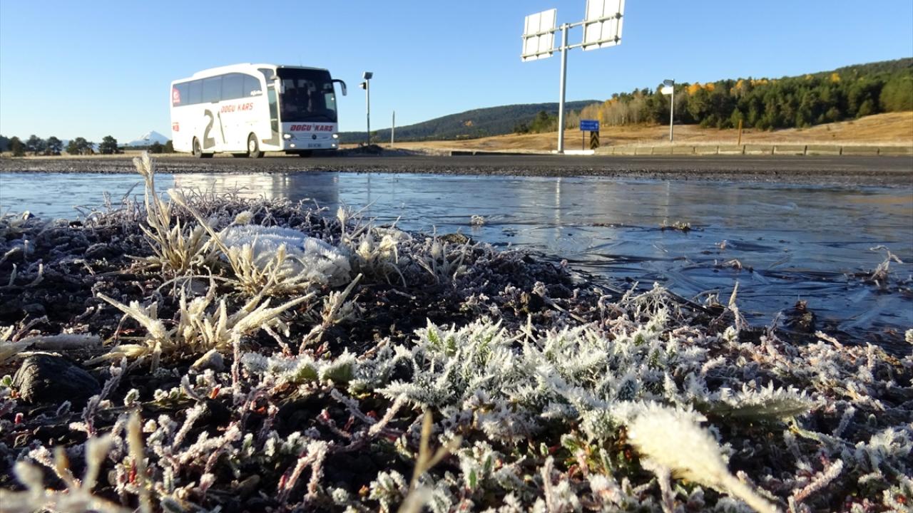 Hava sıcaklığının gece sıfırın altında 3 dereceye düştüğü Kars`ta, su birikintilerinin yüzeyi dondu.