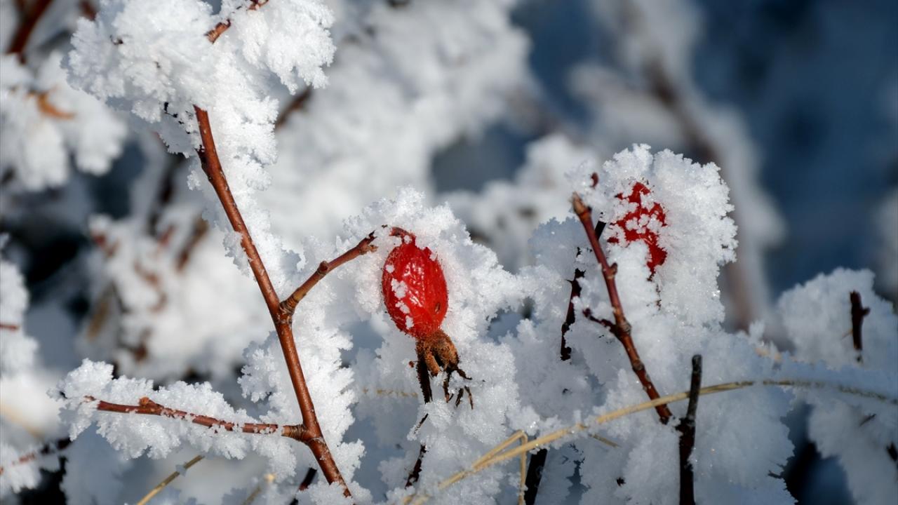 Ardahan`da soğuk hava nedeniyle sis oluştu, civardaki bitki ve ağaçları kırağı tuttu.
