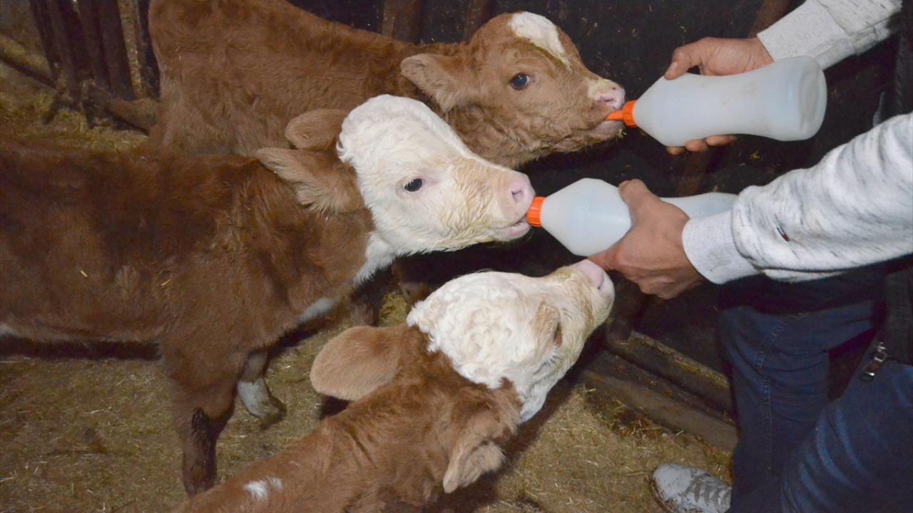 Besici ailenin ilgi odağı haline gelen sevimli buzağılara biberonla takviye süt veriliyor.