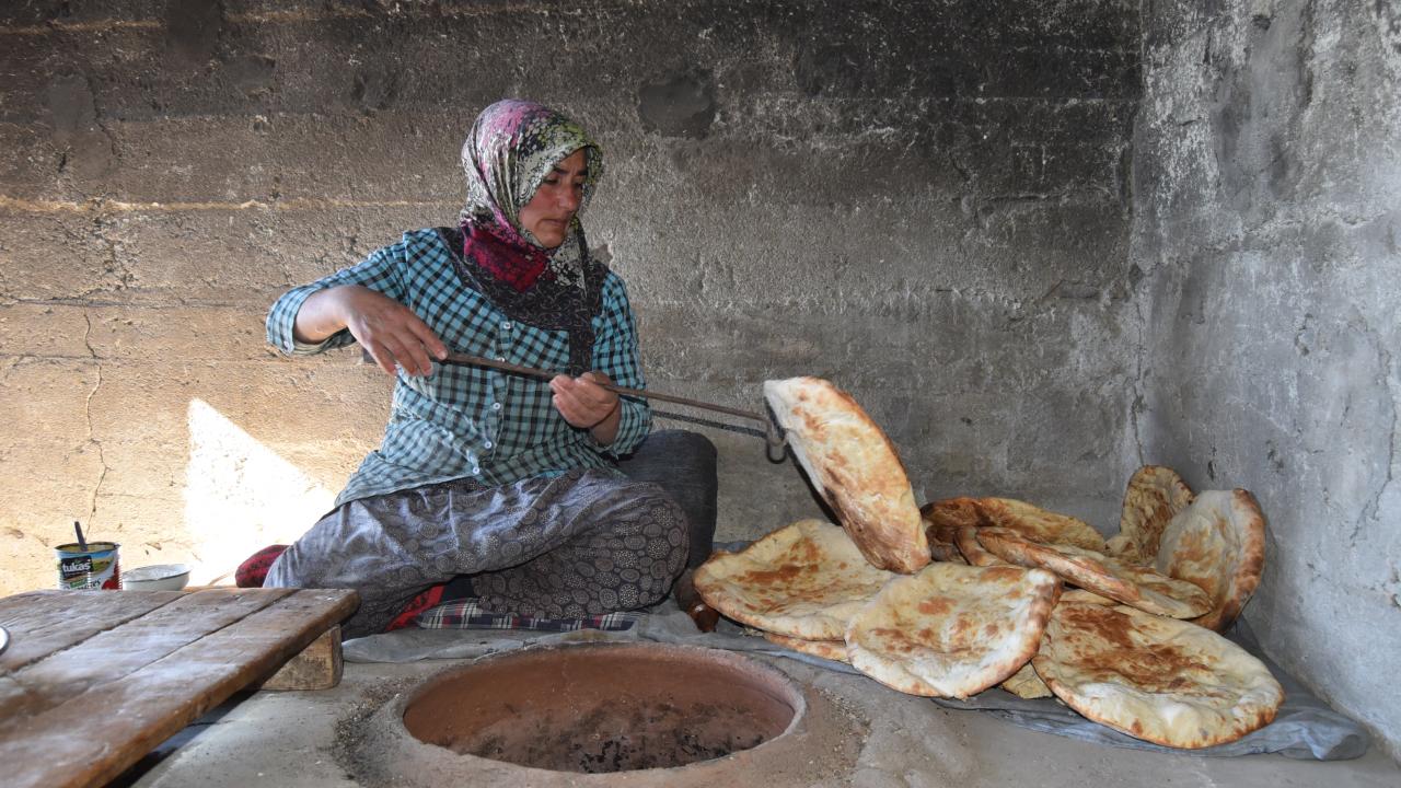 Tandırın yeterli ısıya, hamurun istenen kıvama ulaşmasıyla tandırda ekmek pişiren kadınlar, evlerinin ekmek ihtiyaçlarını karşılıyor.