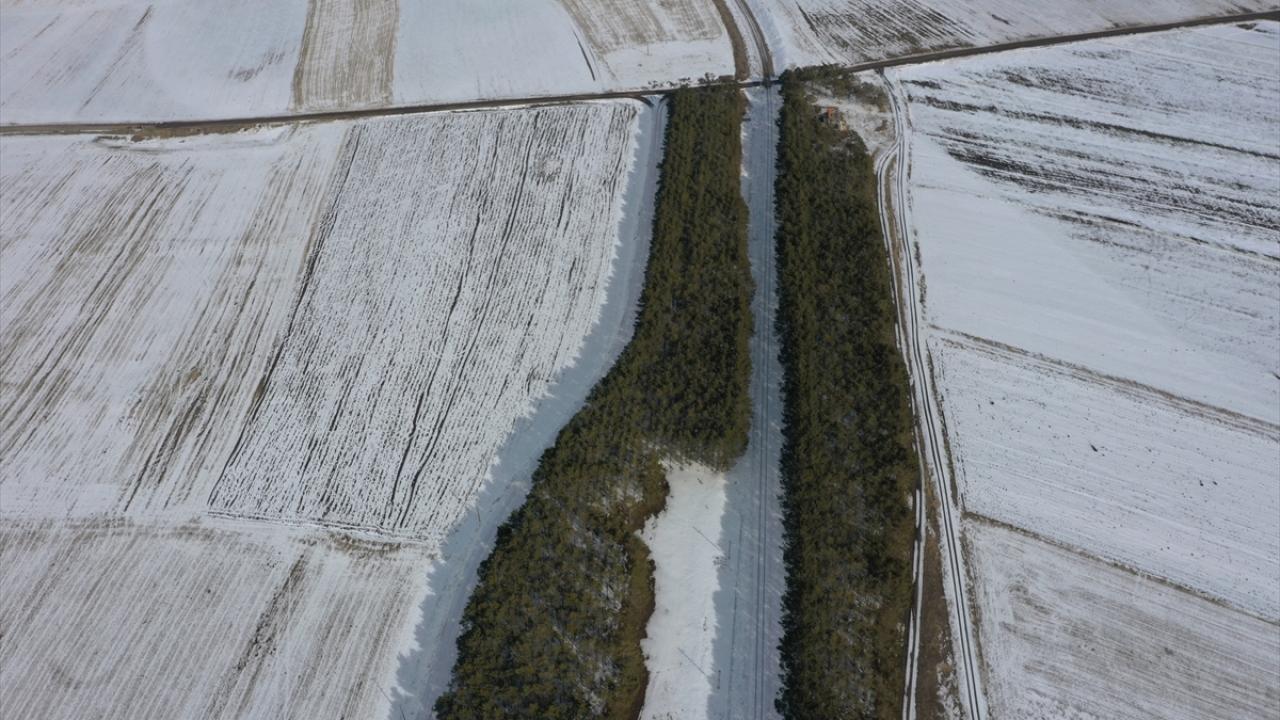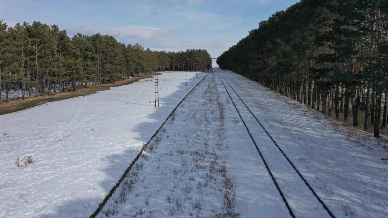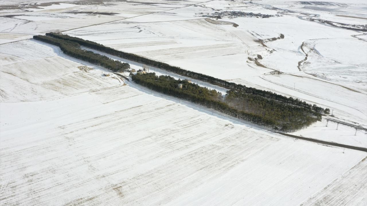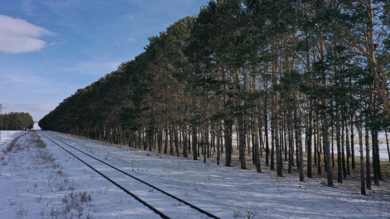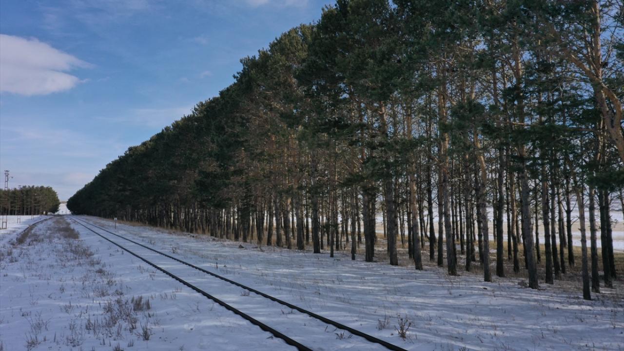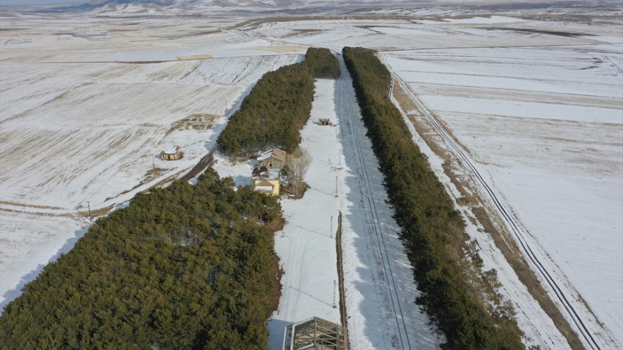 Kars'ın Selim ilçesinde 55 yıl önce Türkiye Cumhuriyeti Devlet Demiryollarınca (TCDD) ağaçlandırılan bozkırın ortasındaki tren istasyonunun çevresi karla kaplandı.