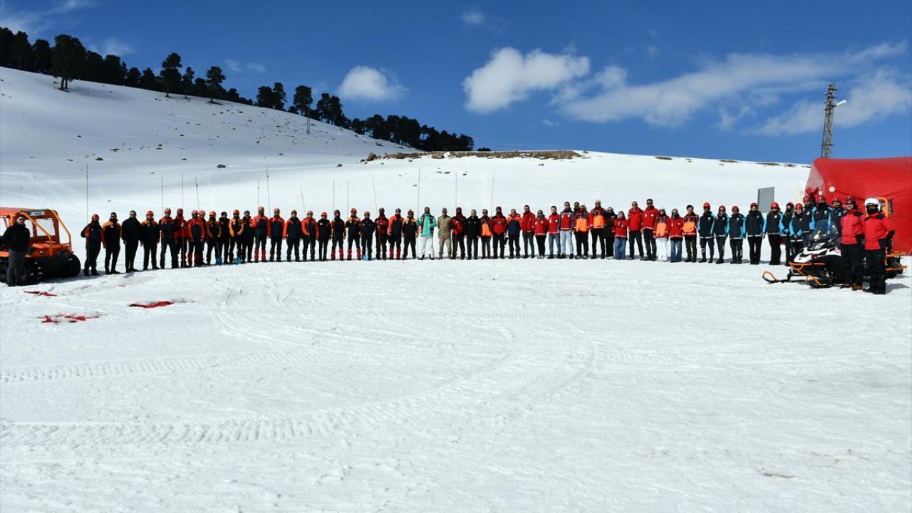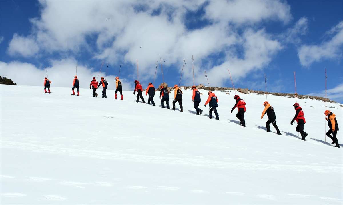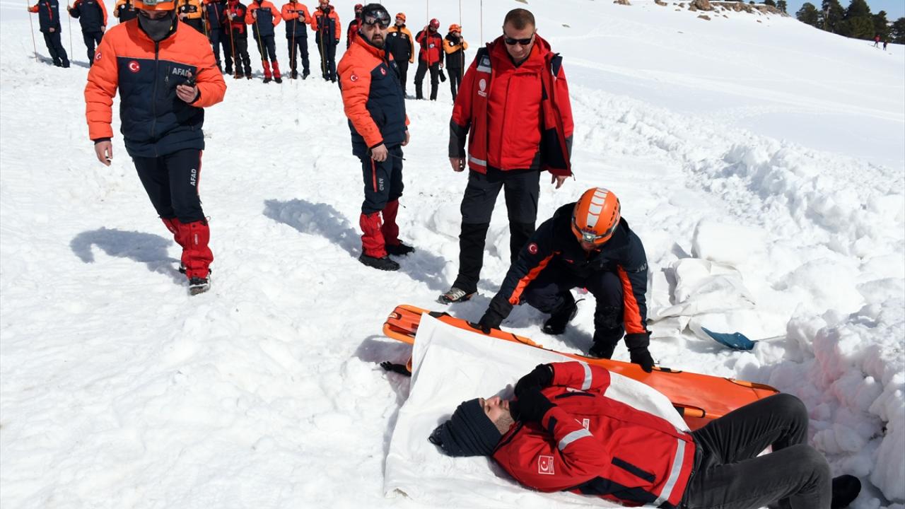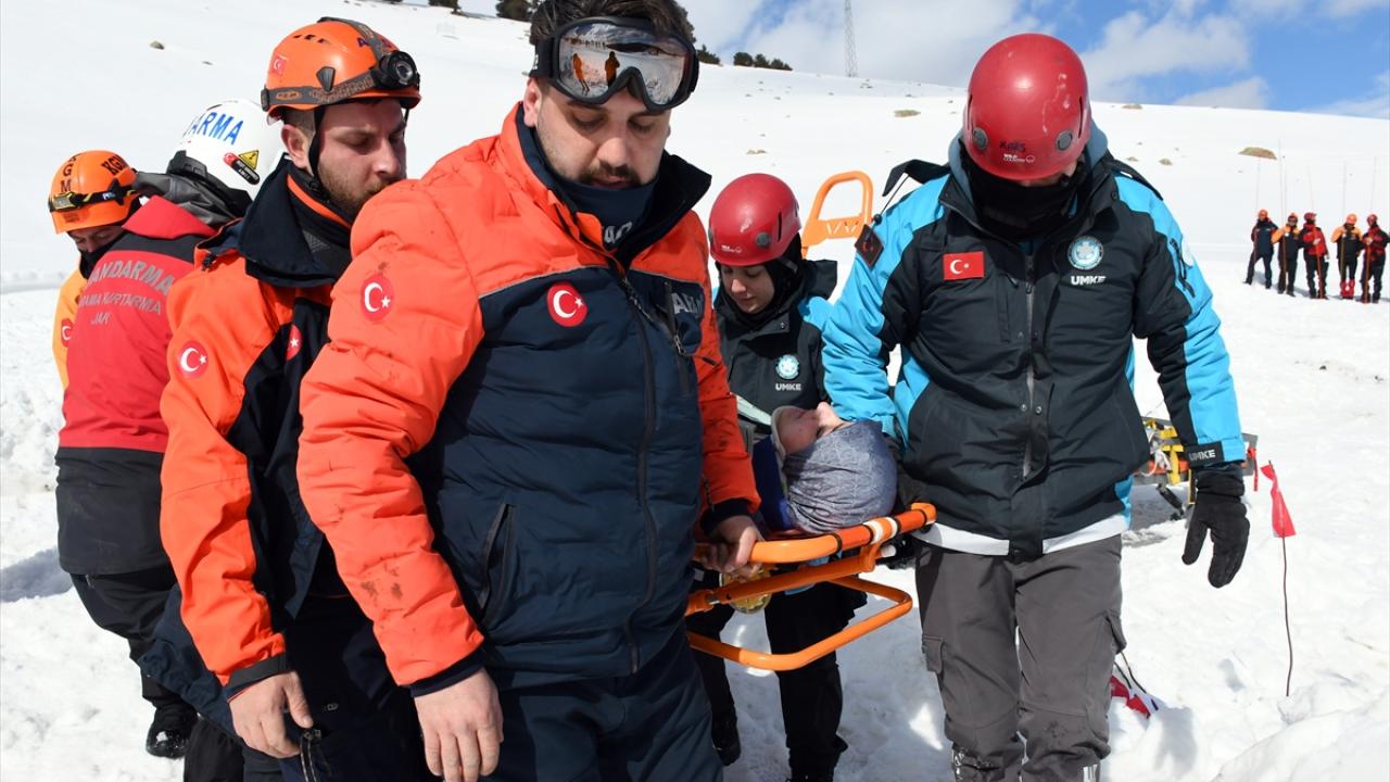 Tatbikatta, senaryo gereği Ay Yıldız Tepesi`nde doğa yürüyüşü yapan 3 kişi çığ altında kaldı.
