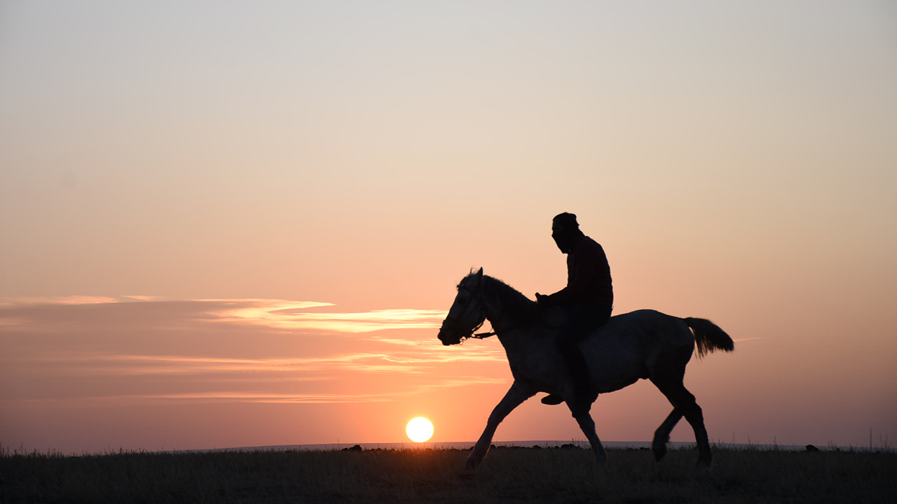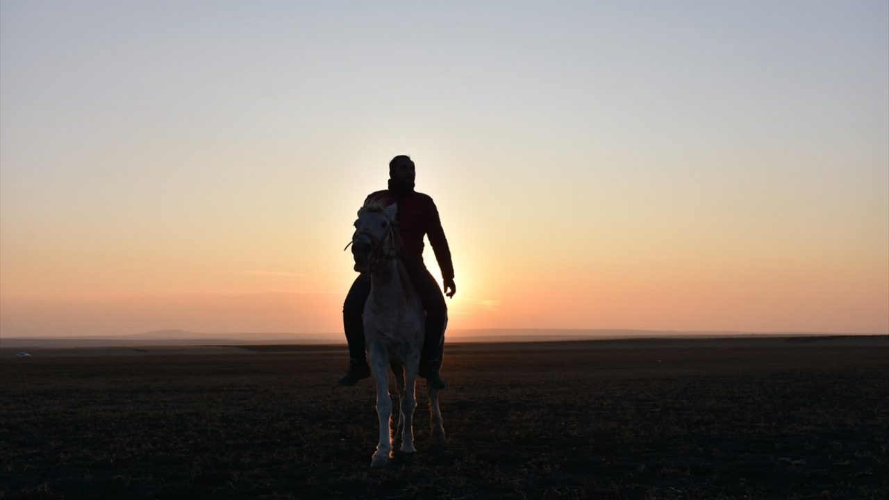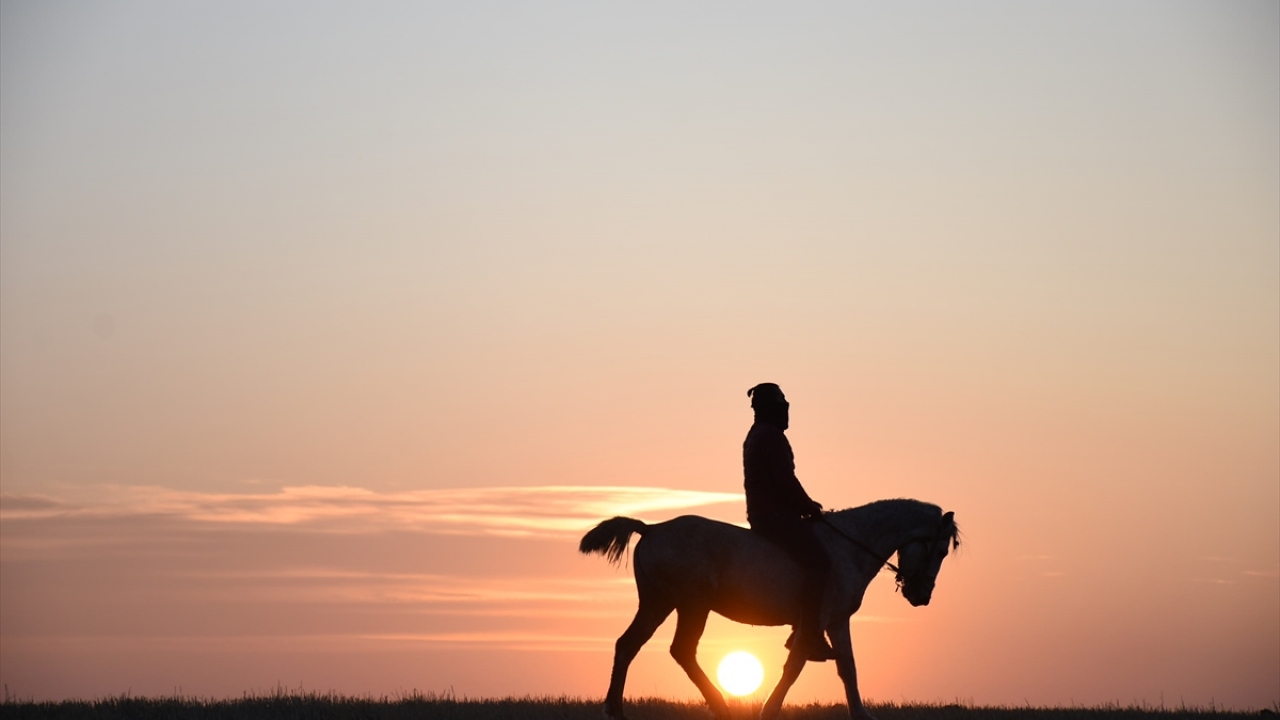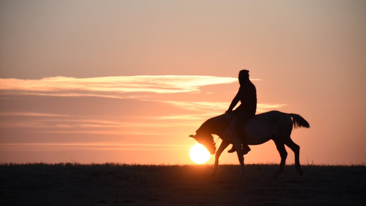 Kars'ın Arpaçay ilçesine bağlı Kuyucuk köyünde gün batımı atlarla birlikte görsel şölen oluşturdu.