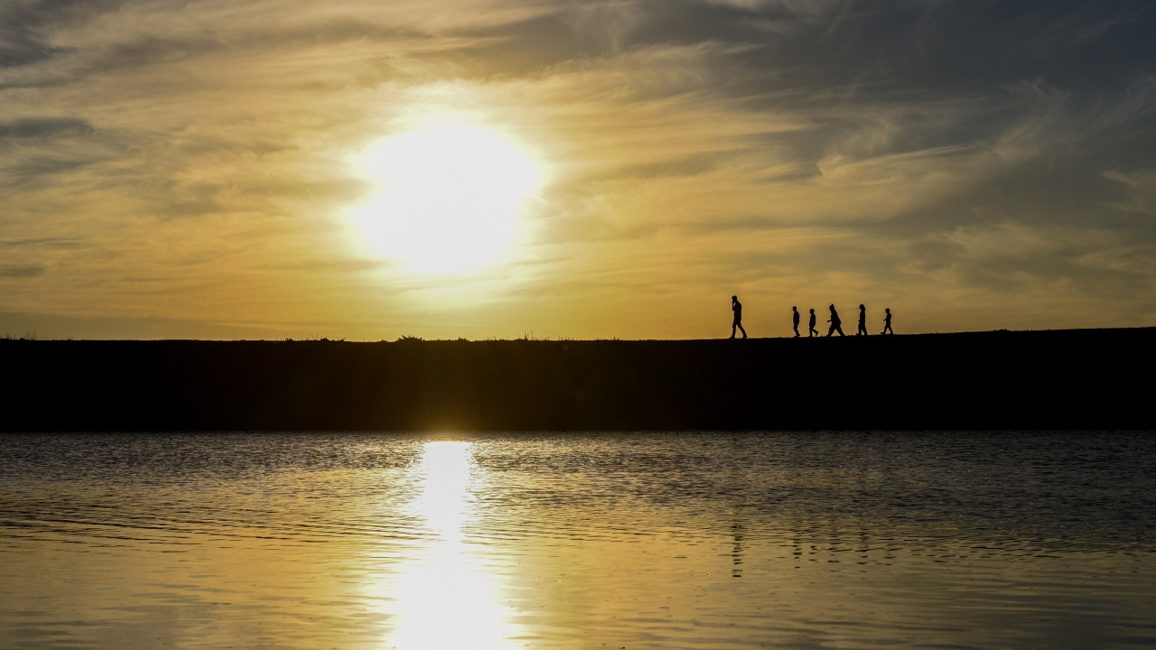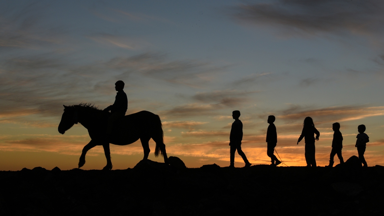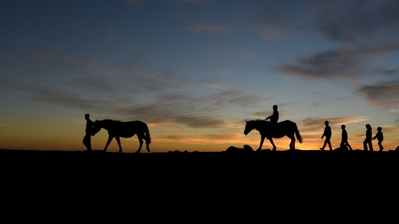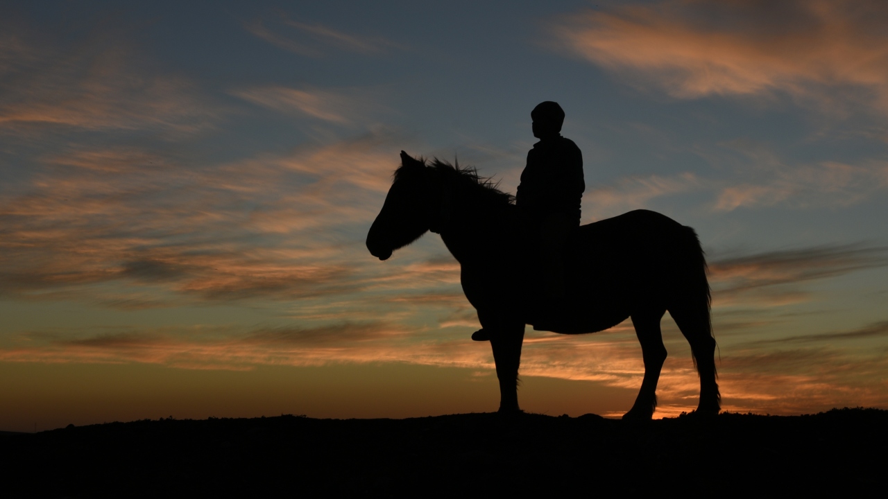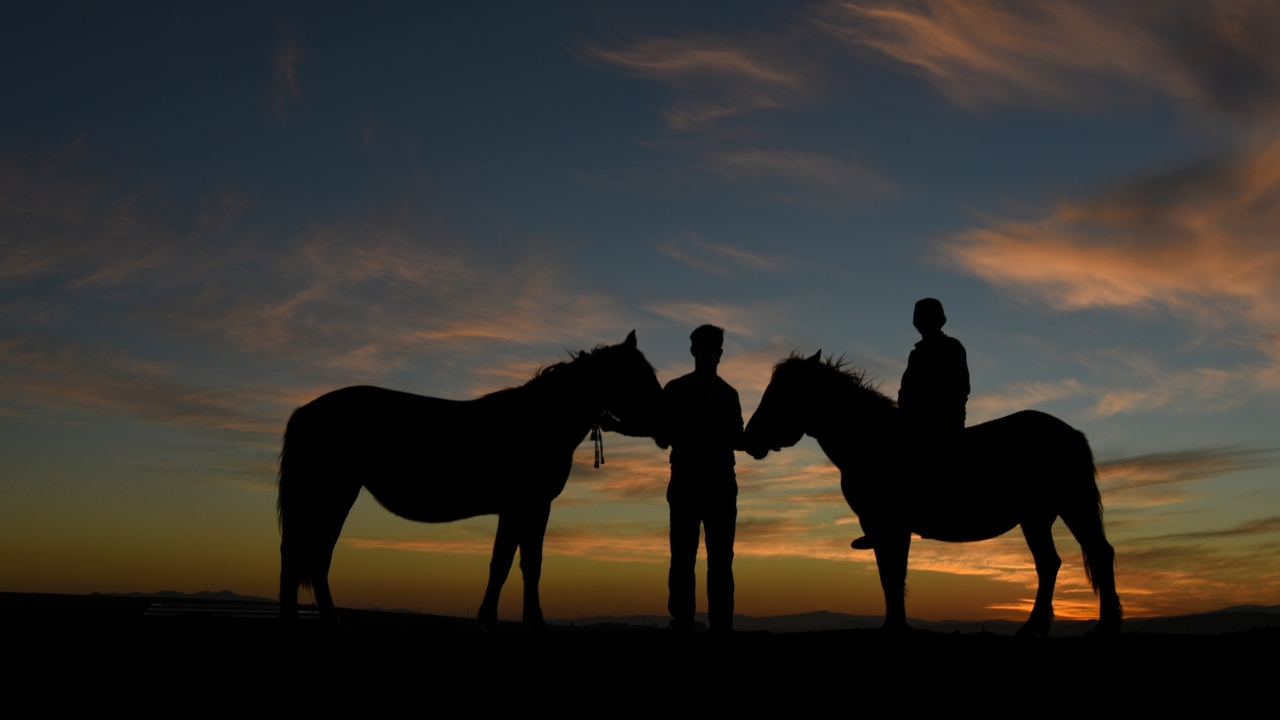 Kars'ta gün batımında oluşan manzara ve atlarıyla yoldan geçen vatandaşların silüetleri güzel görüntü oluşturdu.