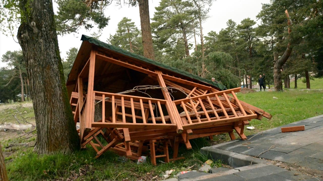 Bahçede belediye tarafından yapımı devam eden kameriyeler çamların altında kaldı, polis ve itfaiye ekipleri olay yerinde inceleme yaptı.
