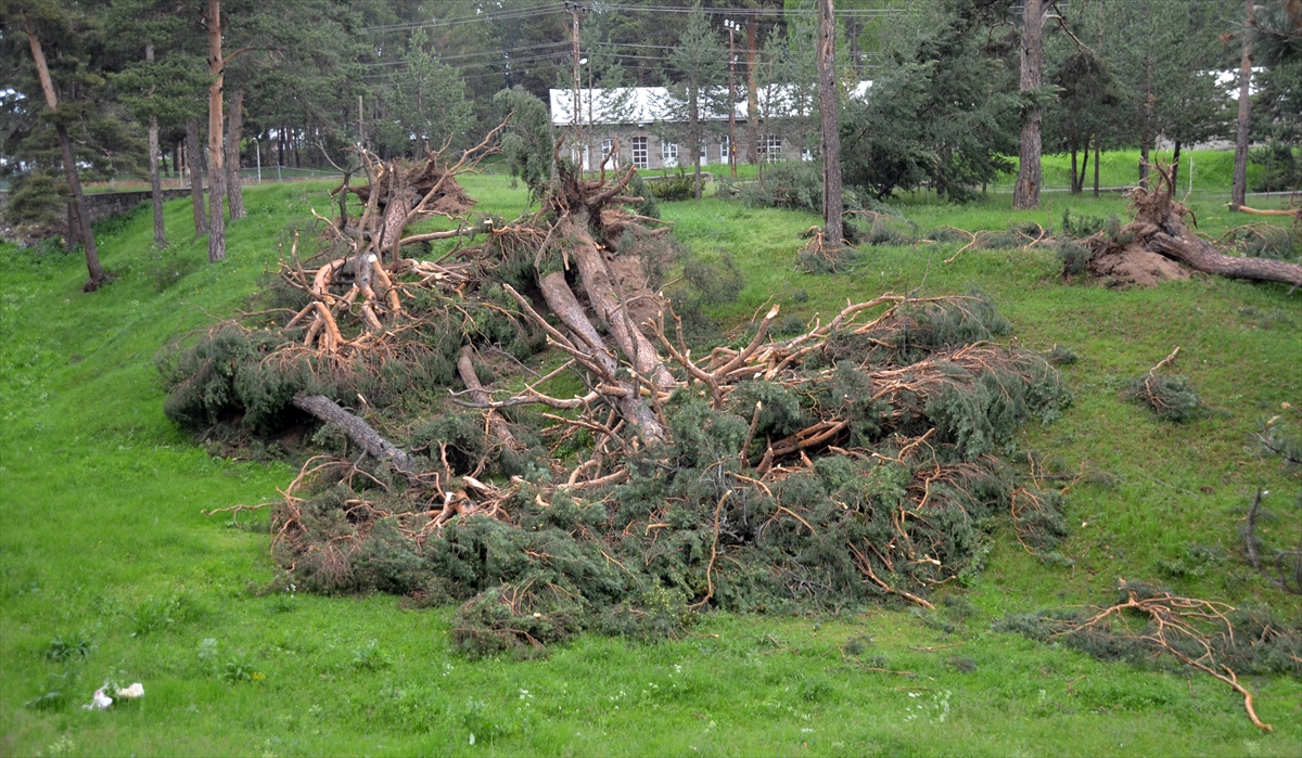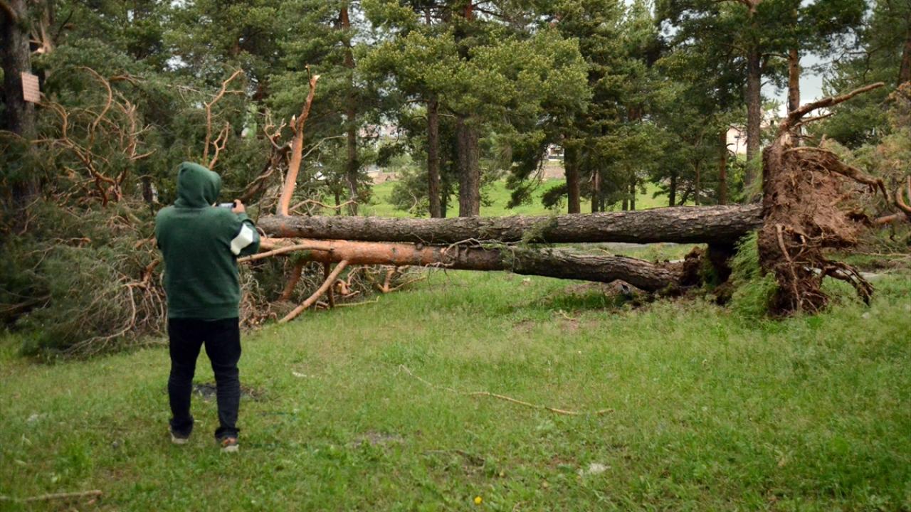 Sarıkamış`ta İnönü Mahallesi`nde bulunan millet bahçesinde aniden oluşan hortum, ağaçları kökünden söktü.