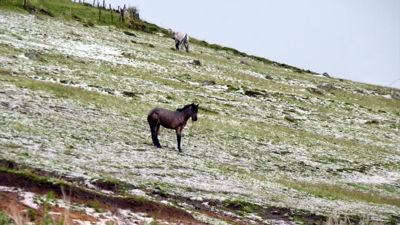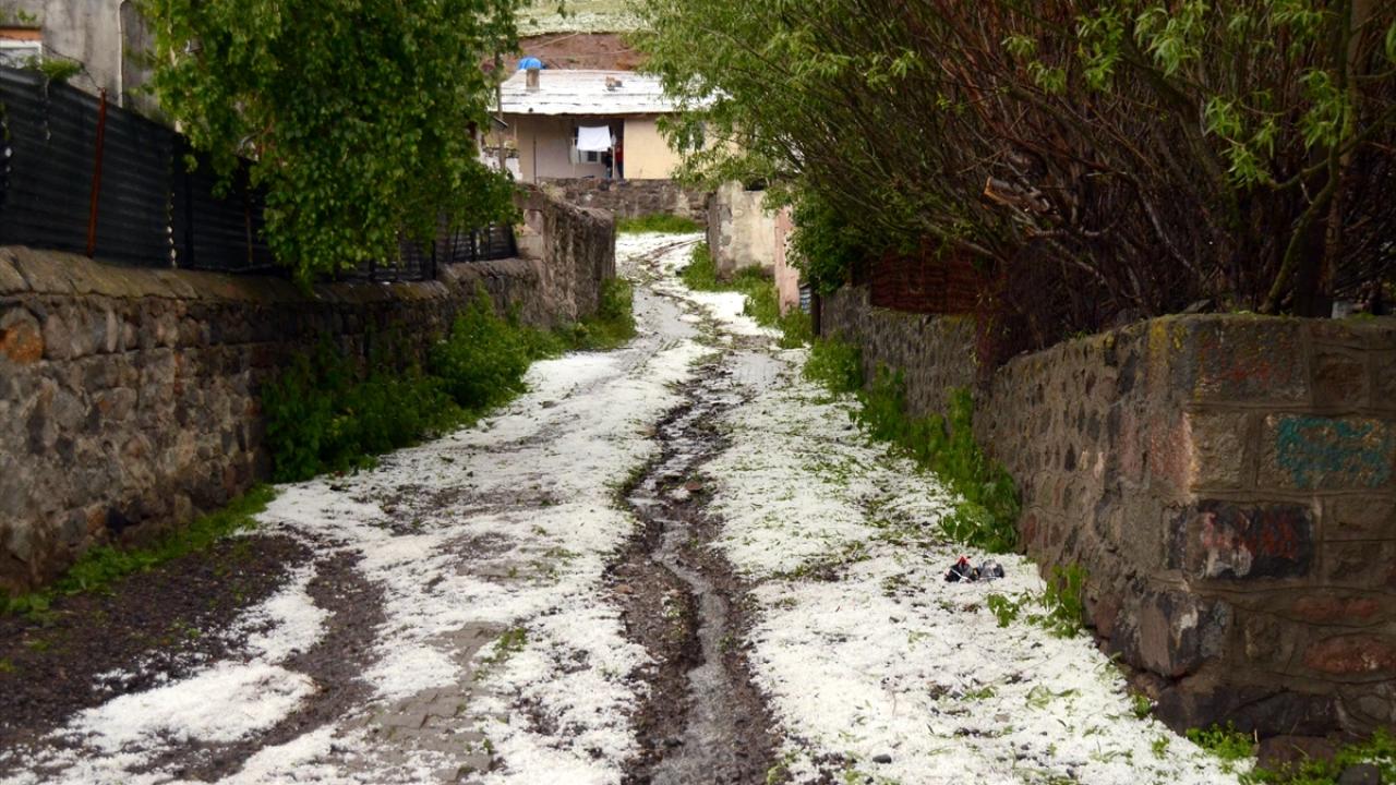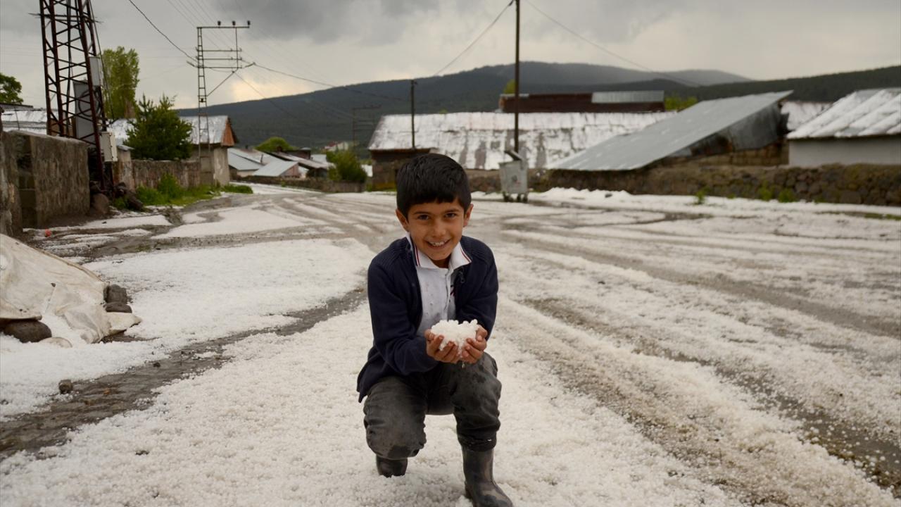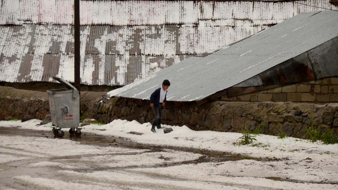 Öte yandan İstasyon Mahallesi`nde etkili olan dolu çevreyi beyaza bürüdü.