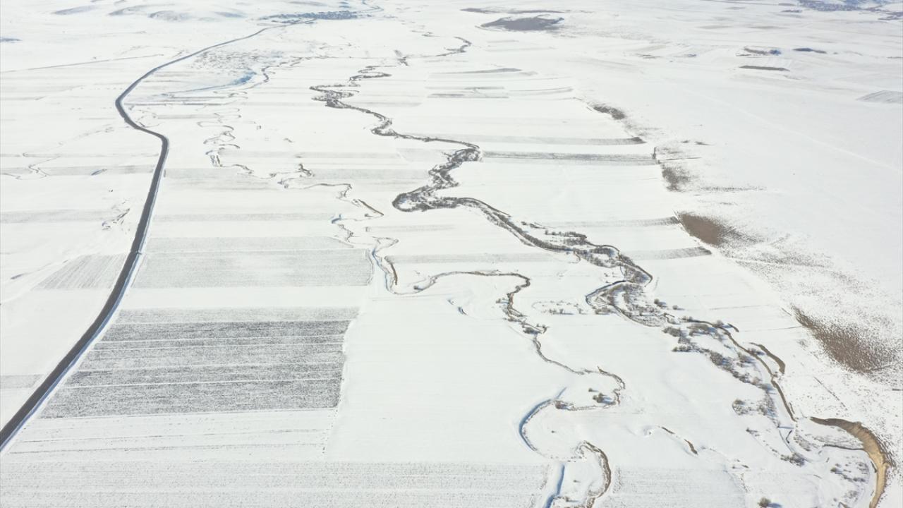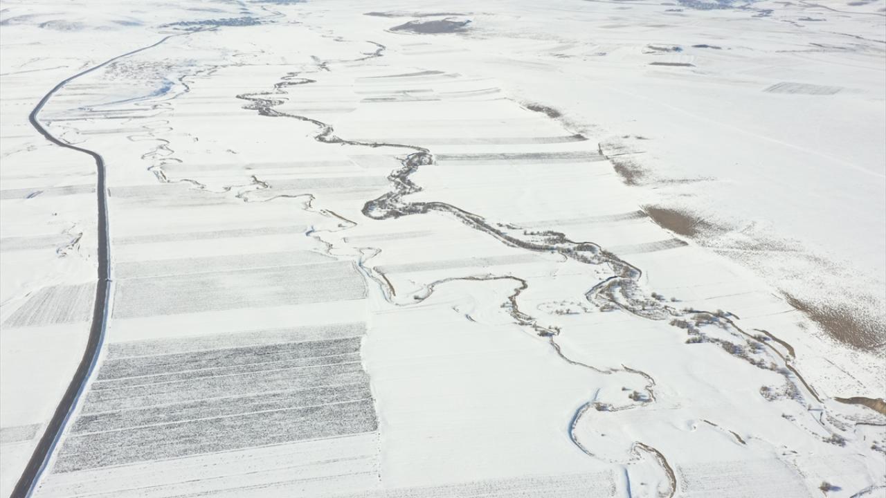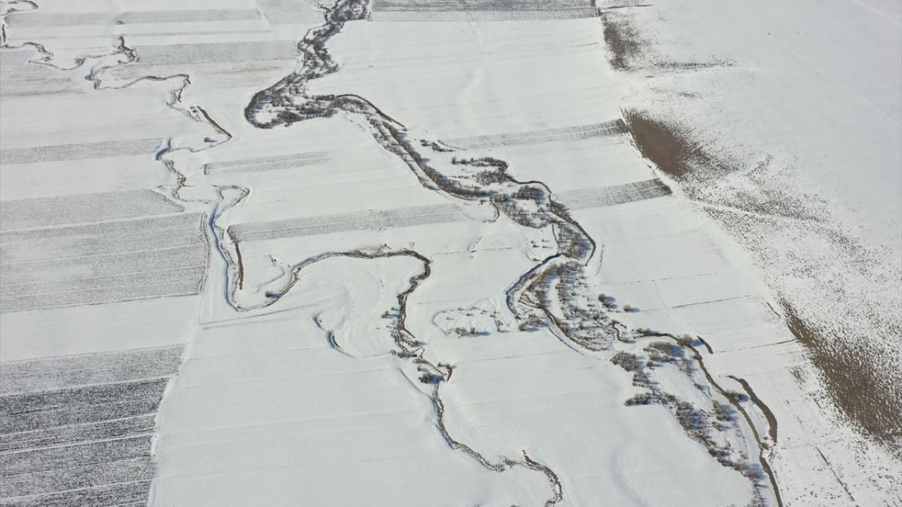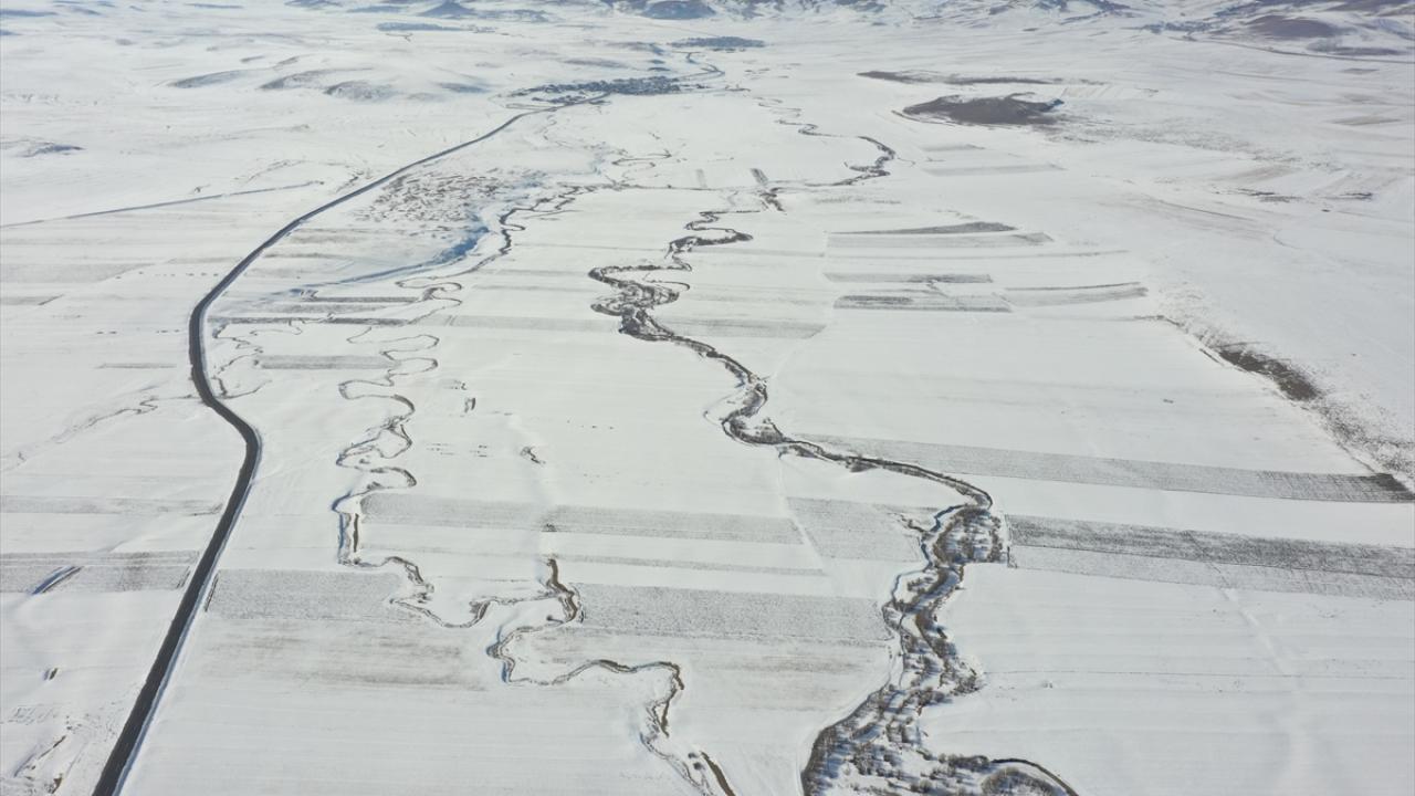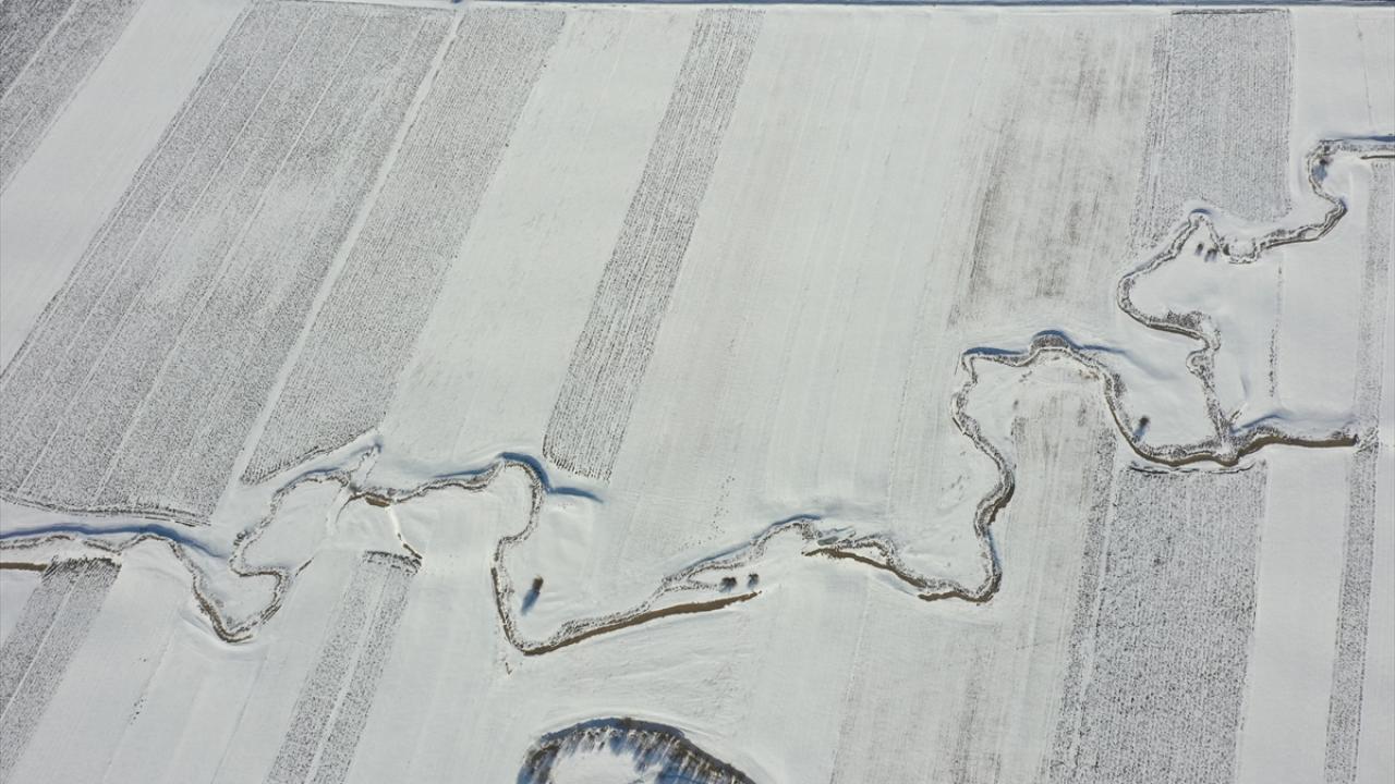 Beyazla kaplanan arazilerde görsel güzellik sunan menderesler dronla görüntülendi.