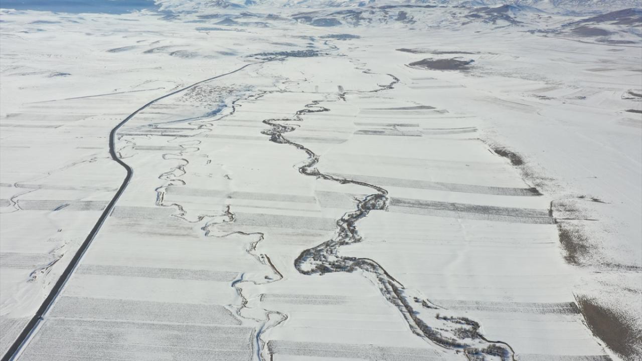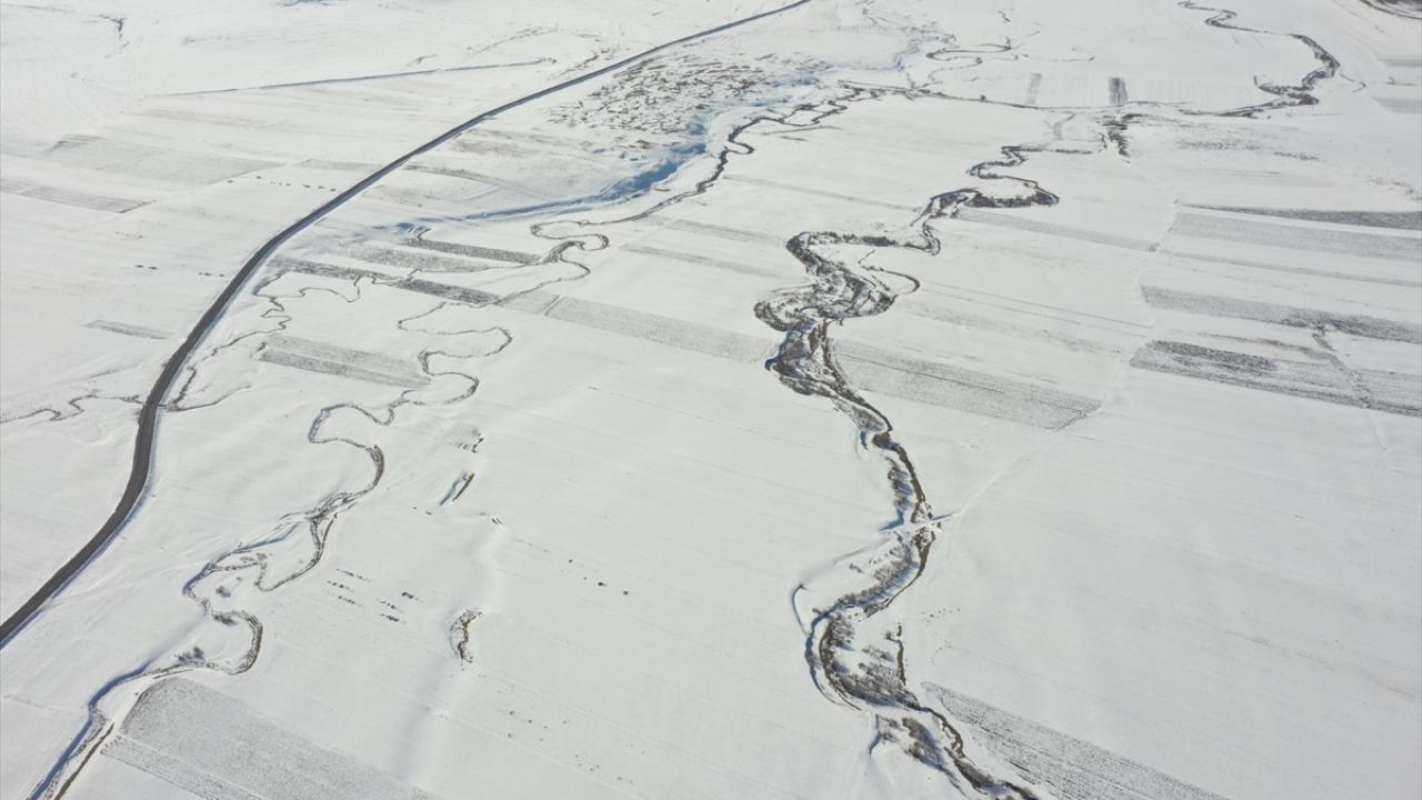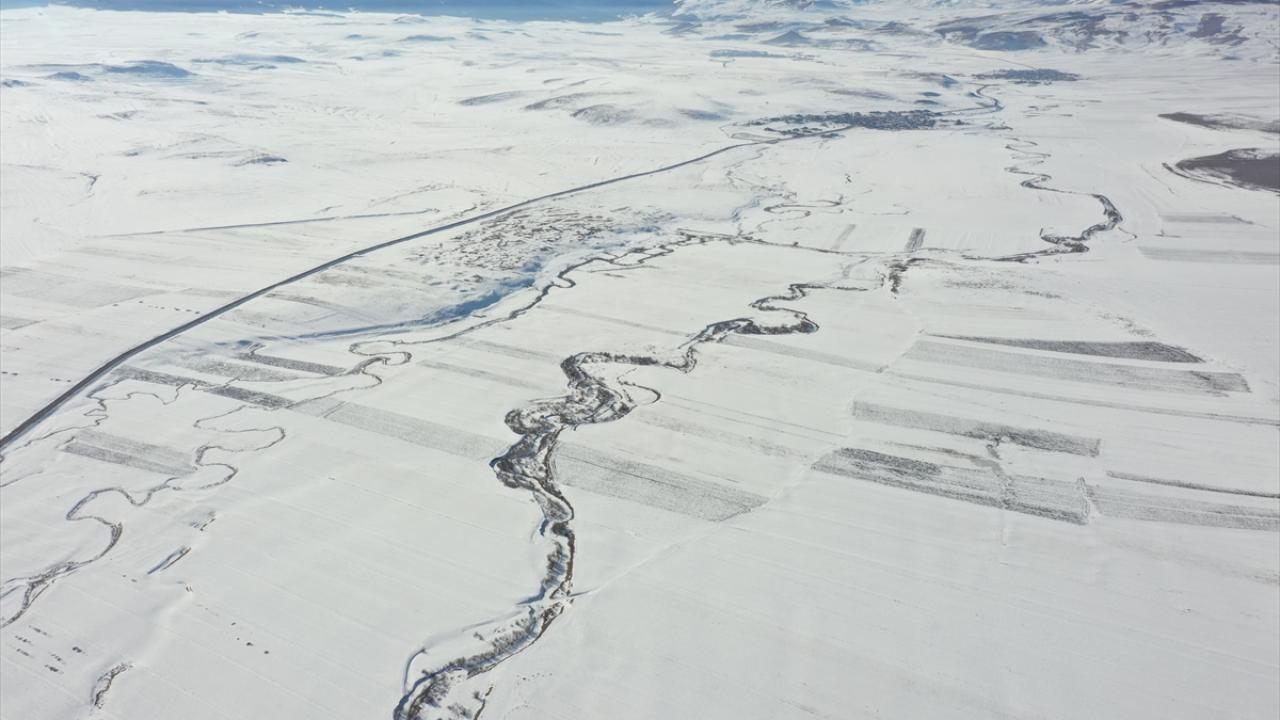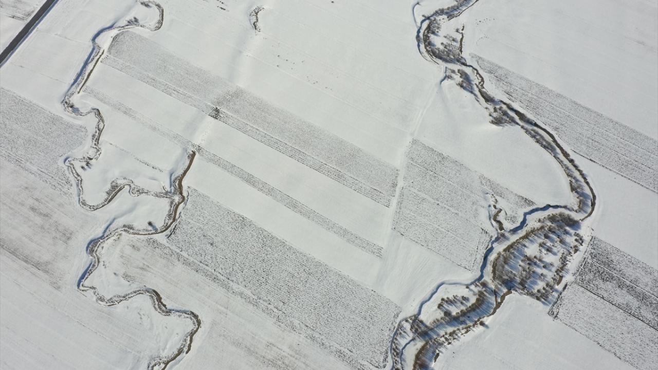 Beyazla kaplanan arazilerde görsel güzellik sunan menderesler dronla görüntülendi.